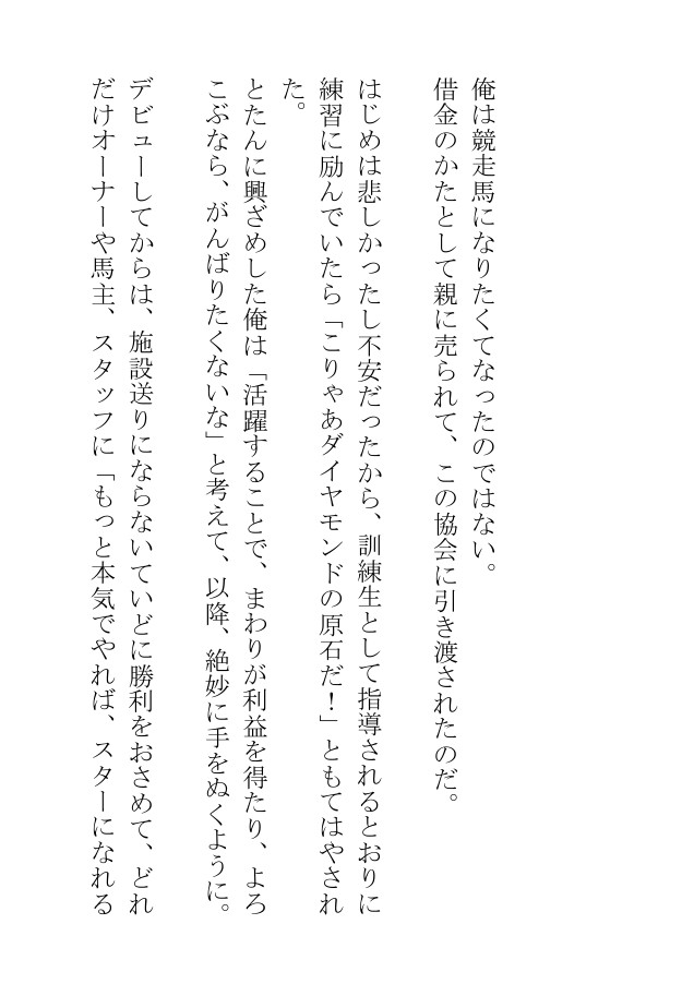 競走馬として訳ありだったり、悩みを抱えていたり、感情をこじらせている彼らが、○○師などの個性豊かで癖の強い男たちに、どろどろぐちょぐちょに甘々に○○されまくるBL小説です。