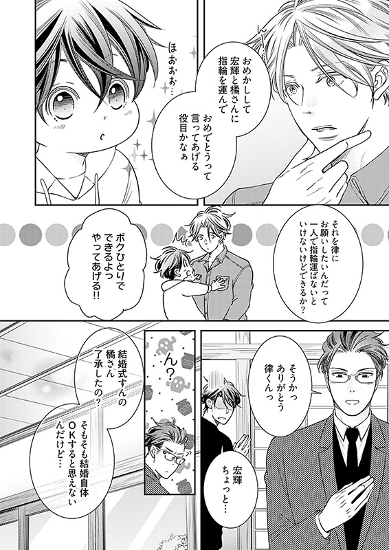 料理上手で○○好き。結婚願望もあるのに【とある理由】で、いまだ独身な三十路の建築士・宮野凌(みやの りょう)。ある日、火事で自宅マンションが水浸しになってしまった親友・大我(たいが)の頼みで、大我が引き取った甥・律(りつ)と3人で同居生活することに。かわいい律の世話を焼くのは楽しいけど――学生時代から凌を想い続ける大我の過剰なスキンシップに振り回される毎日で!?!?
