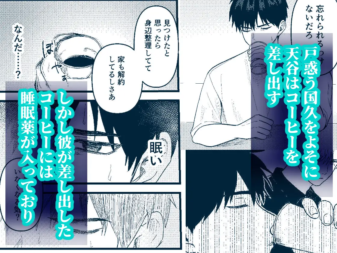 しかし、そのコーヒーには睡眠薬が仕込まれていた。目を覚ますと、国久は天谷に襲われていた。