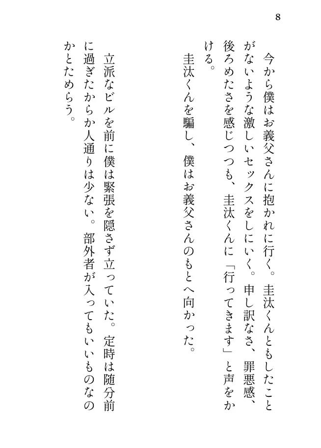 結婚相手の圭汰を愛しつつも義父への欲望を選んでしまう――。受けがランジェリーを着用しています。