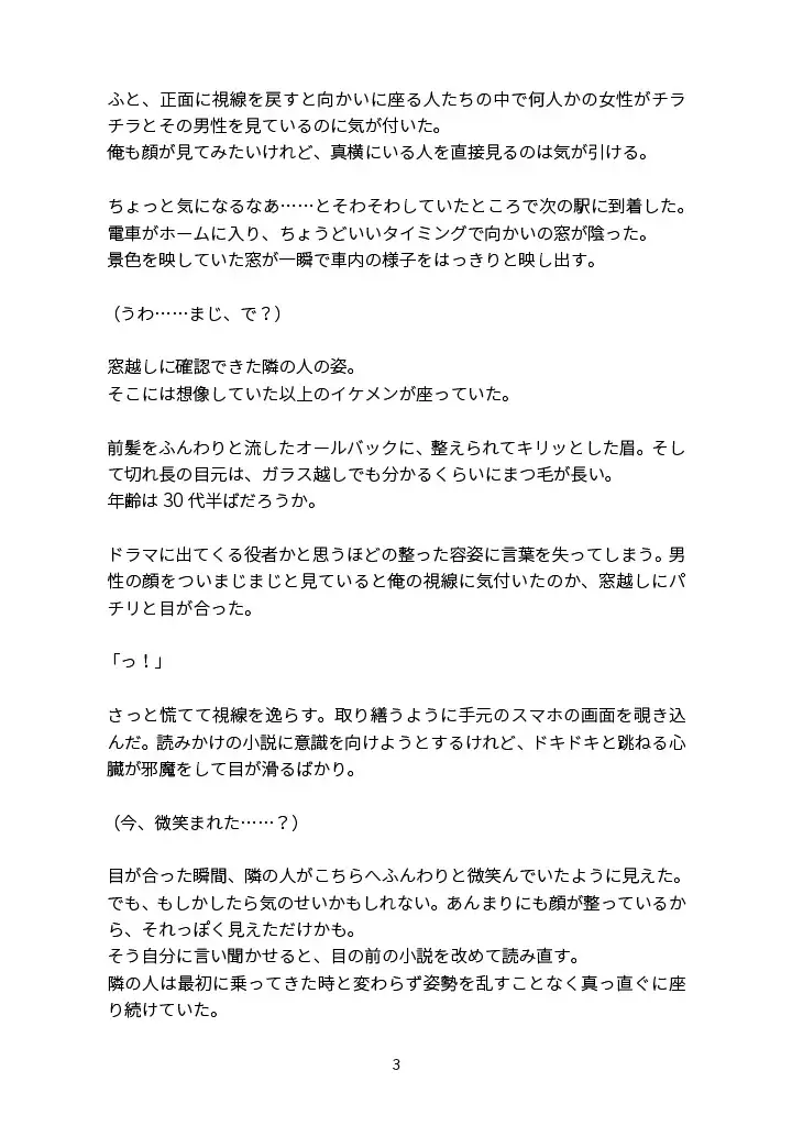『電車で目が合ったイケメンにトイレで襲われる話』電車の隣の席に偶然座ったイケメンと目が合ってしまった主人公