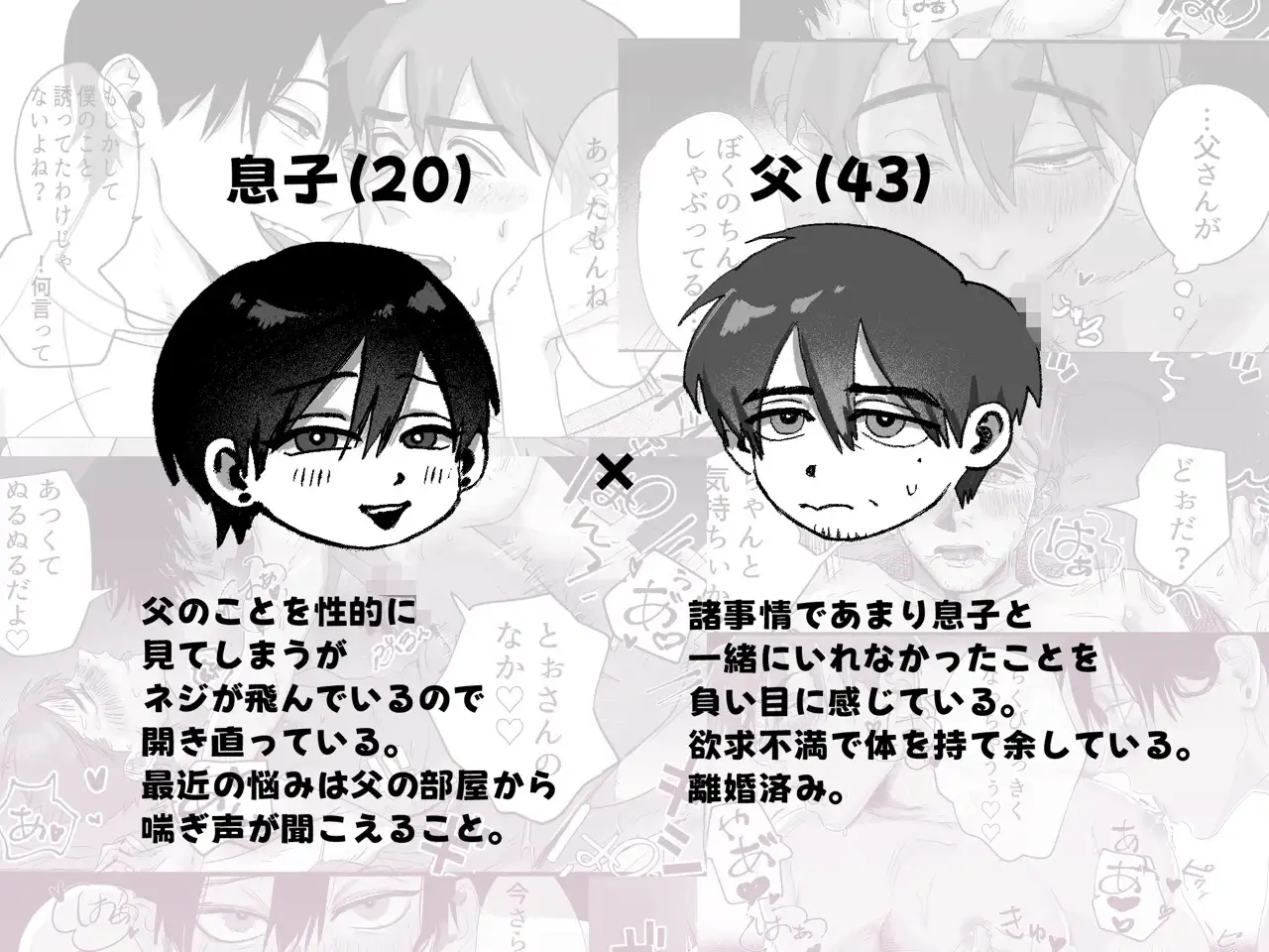 数年ぶりに同居を始めてから数日。夜な夜な父親の部屋から聞こえるいやらしい喘ぎ声に痺れを切らした息子は父親に媚薬を盛ることにした…。息子×父親です。