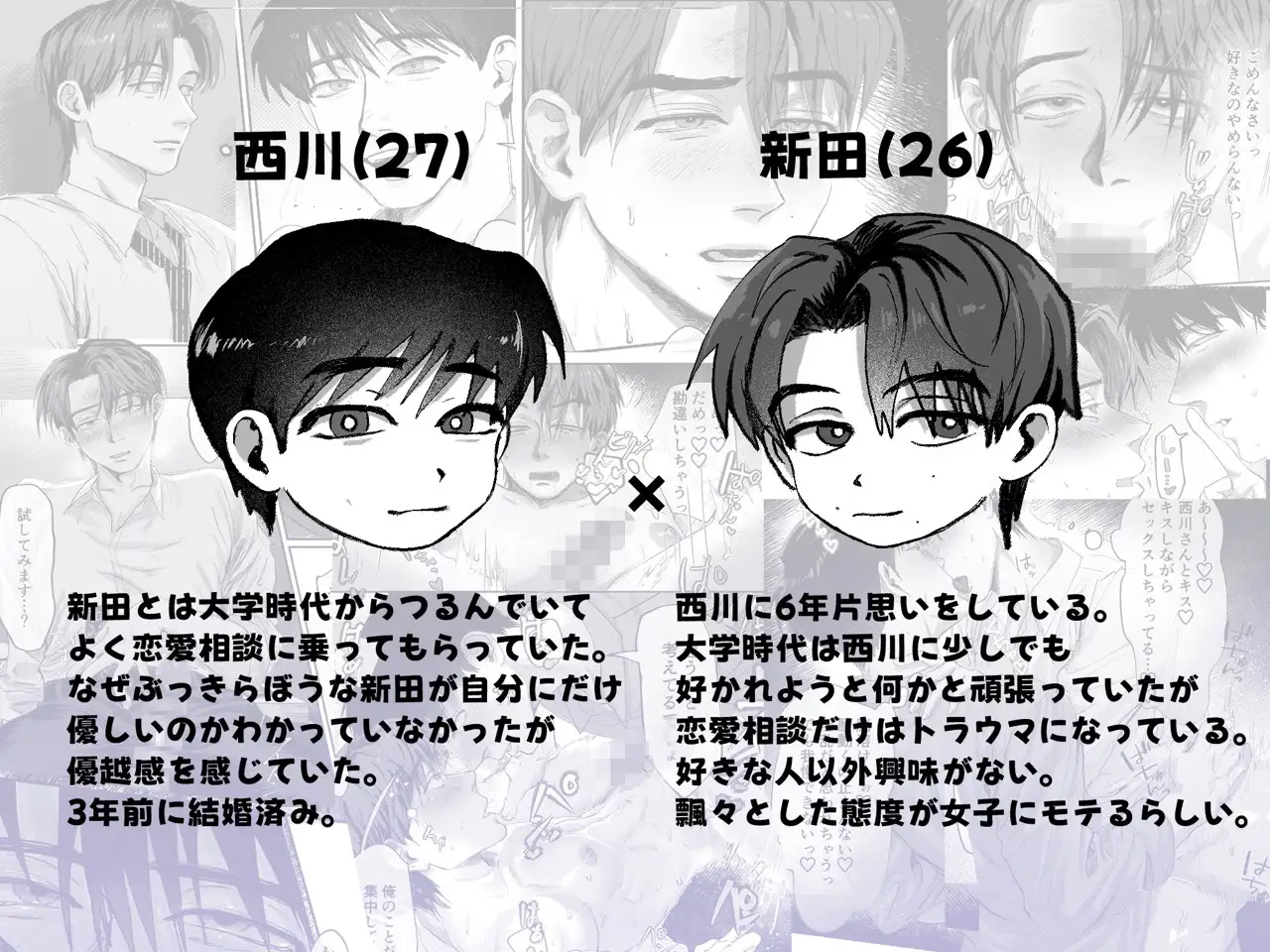さらに、西川自身も他の女と寝ようとしていたと聞き、新田の中で抑えていた嫉妬と未練が溢れ出す…。先輩×後輩です。