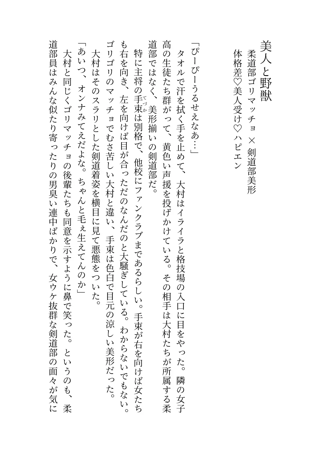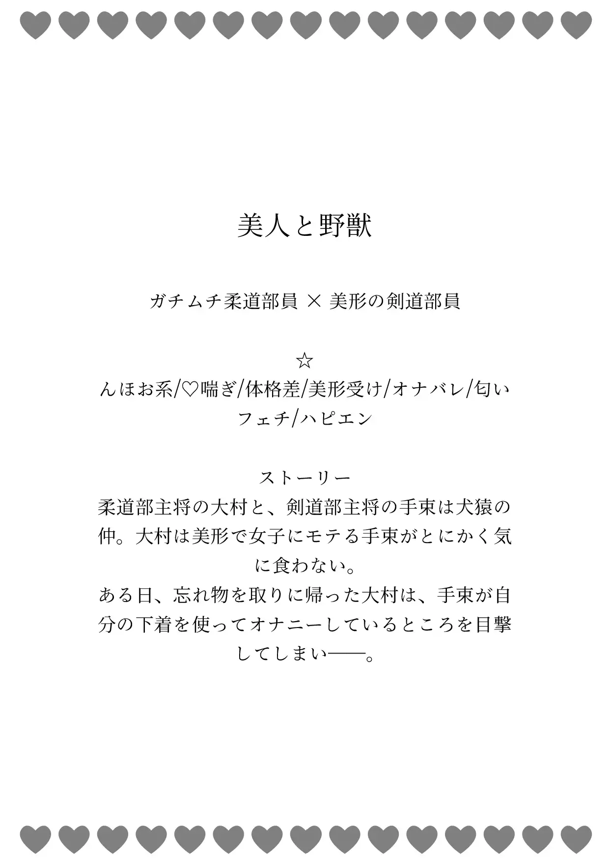 6つの“違うクセ”を一冊に詰め込んだ、成年向けBL小説短編集。・ガチムチ柔道部主将×美形剣道部員の犬猿バトルエロ「美人と野獣」。