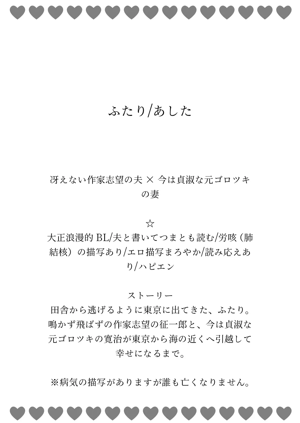 ・大正浪漫BLで紡ぐ切なくも温かい物語「ふたり/あした」。2021年~2024年にかけて書いた作品を全面改稿し、読みやすく整えた文庫本A6サイズ・約5.7万字。