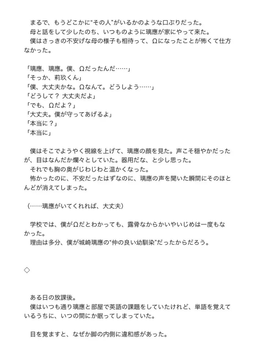 執着×幼馴染×オメガバース平凡なΩである木野莉玖は、幼い頃から幼馴染α・城崎璃應に守られて生きてきた。