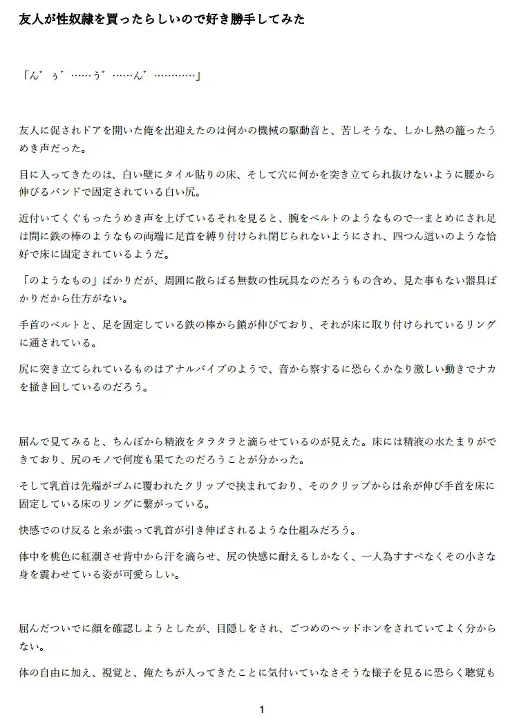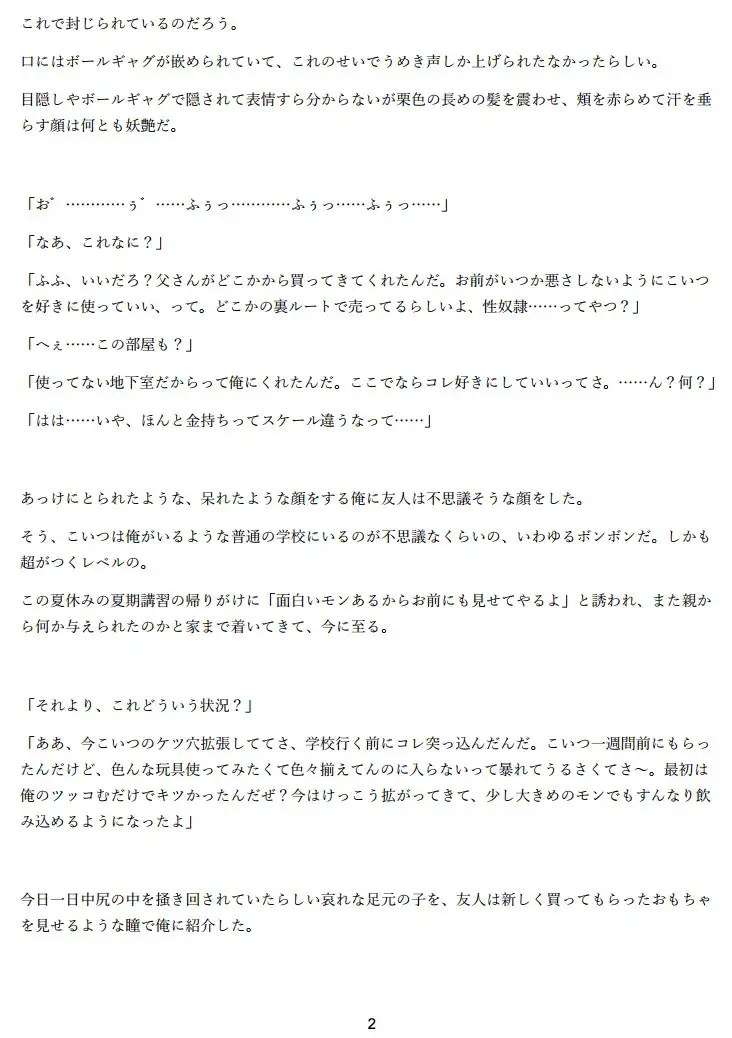 好きにしていいと言うので、この子の体をたっぷり堪能させてもらうことにした。気絶しても許さず、ぐちゃぐちゃになるまで抱き潰し、玩具で遊び、