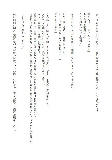 美形×平凡/攻→→→→→受/同年代美人が多いという噂の海に友人と来て早々、砂浜に取り残された俺。