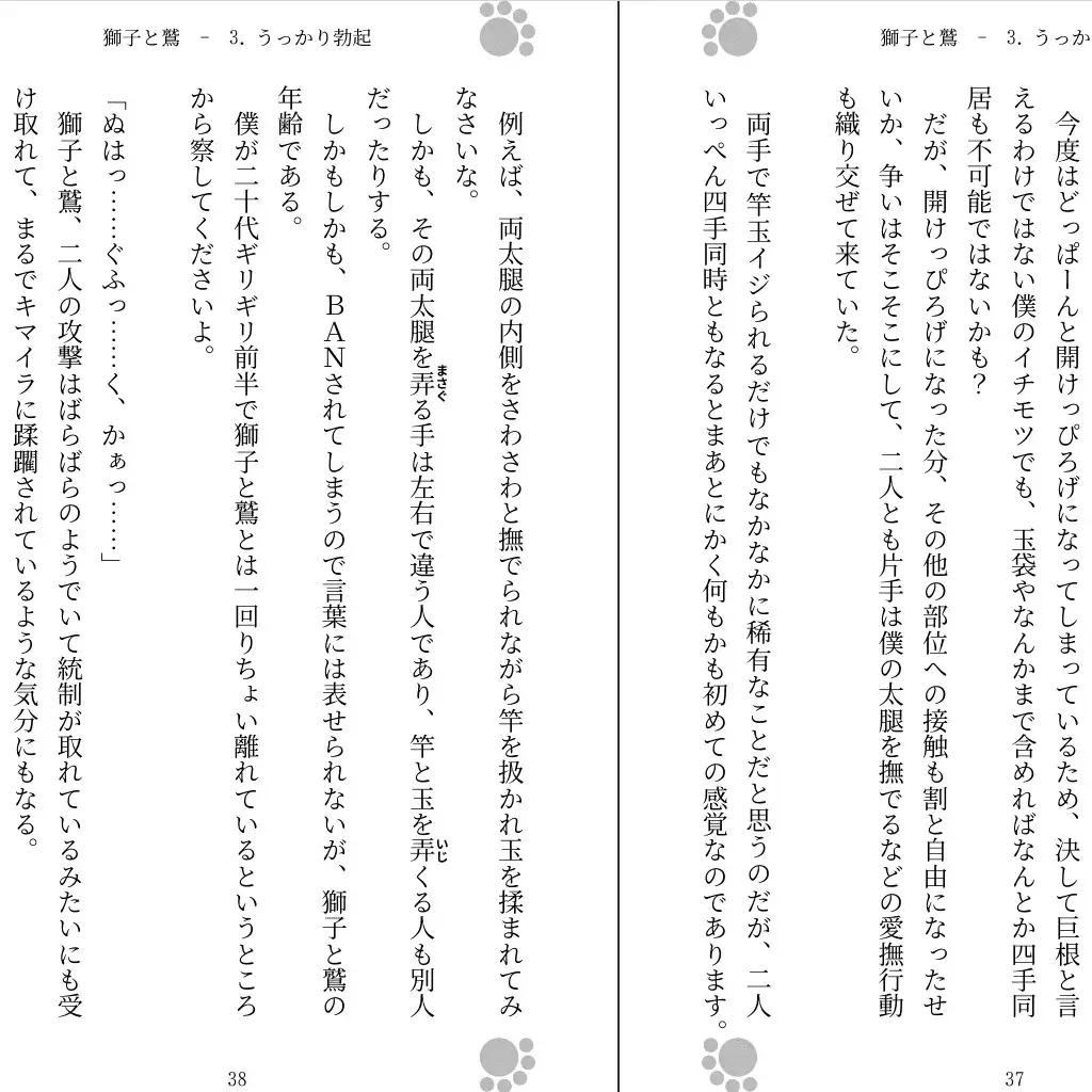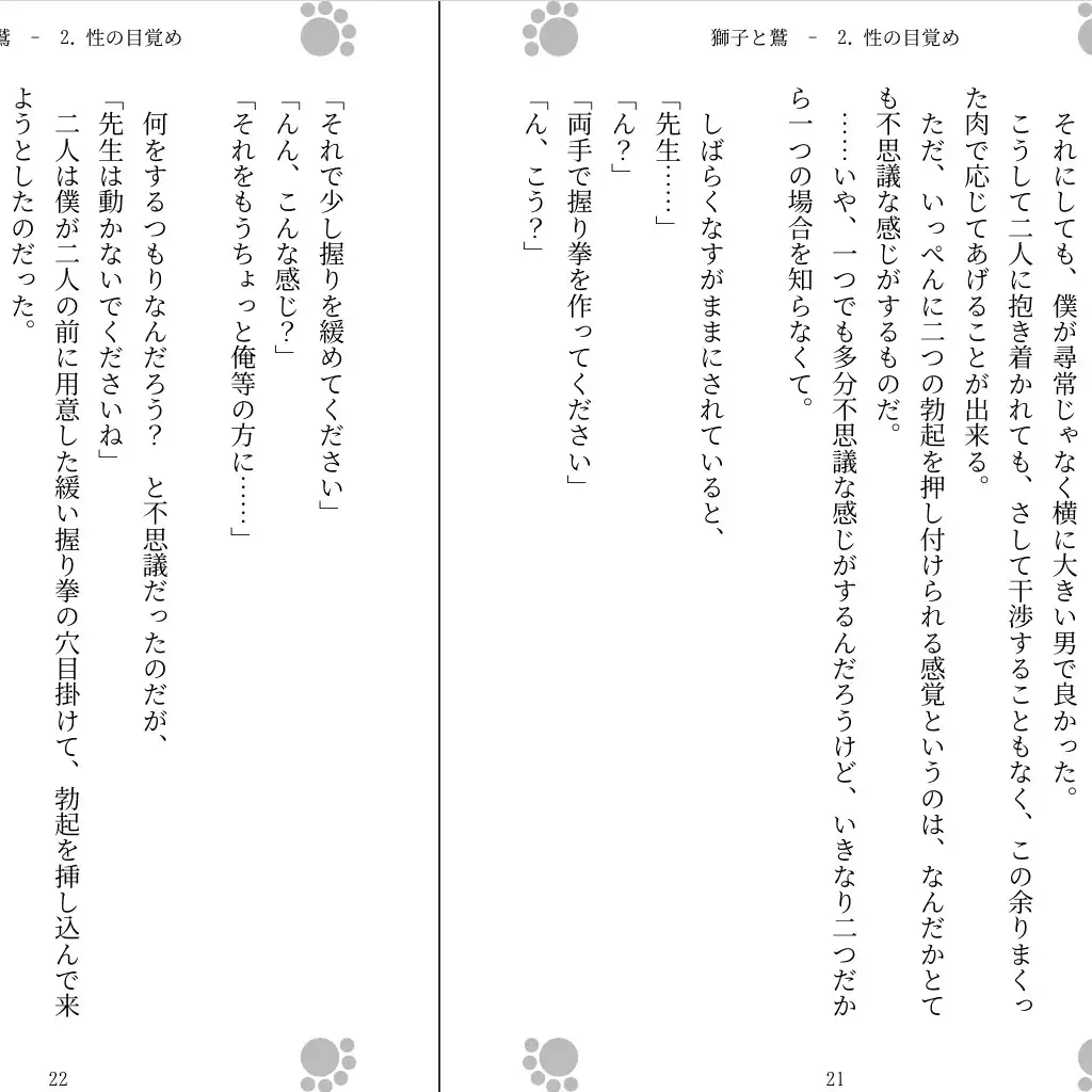 若者の前で第二次性徴を迎えた獅子と鷲は、その若者がきっかけで性に目覚めたと言い、しかし、単純に性交渉を強請るわけにもいかないことを勉強した二人は若者に対して「動かないで」「なすがままにされてくれ」と懇願する。