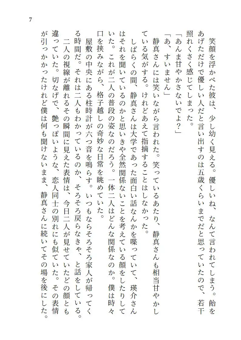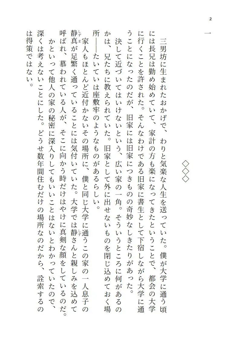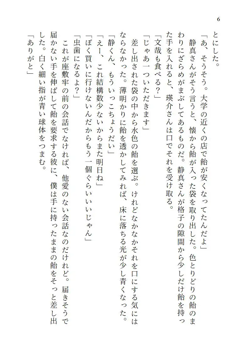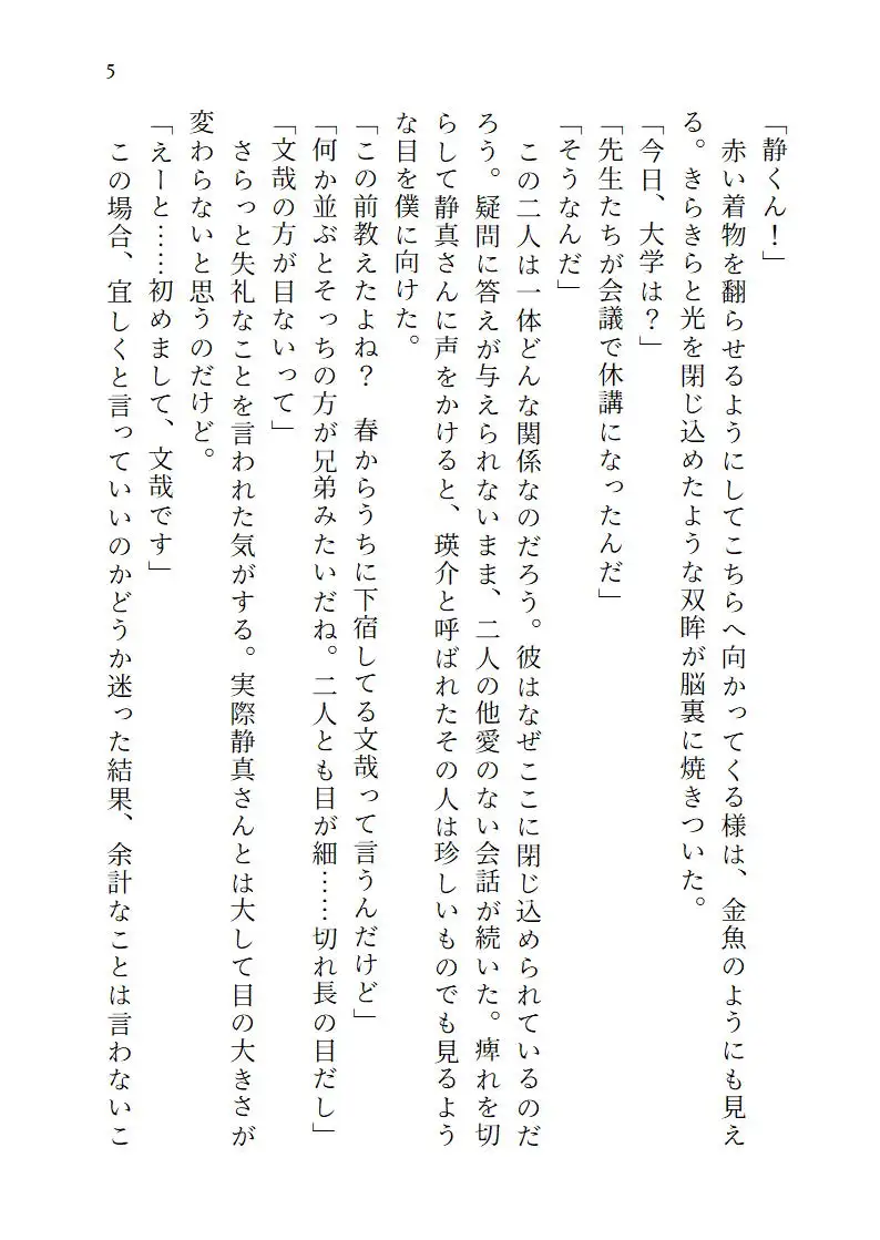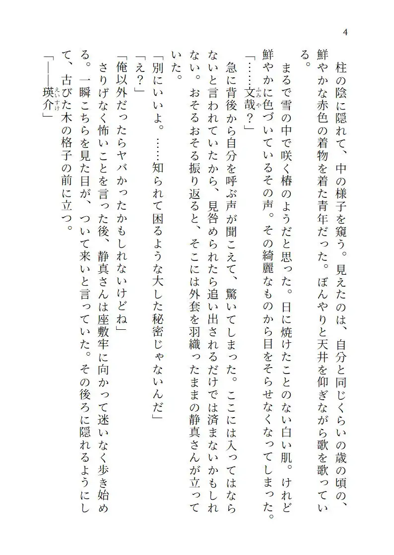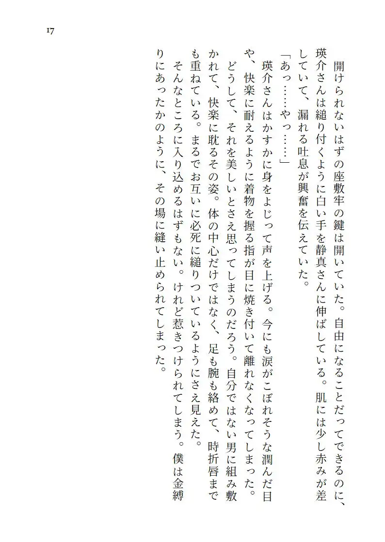 書生としてある名家に居候を始めた青年・文哉は、その名家の奥にある座敷牢に閉じ込められている青年・瑛介と出会う。瑛介はこの家の当主の子ではあるが愛人の子であるため、存在しないものとして閉じ込められているのだという。当主の息子であり文哉の先輩である静真に、瑛介と仲良くしてほしいと言われる文哉。瑛介と仲良くなっていく文哉だが、ある日、静真と瑛介が繋がっているところを目撃してしまう。