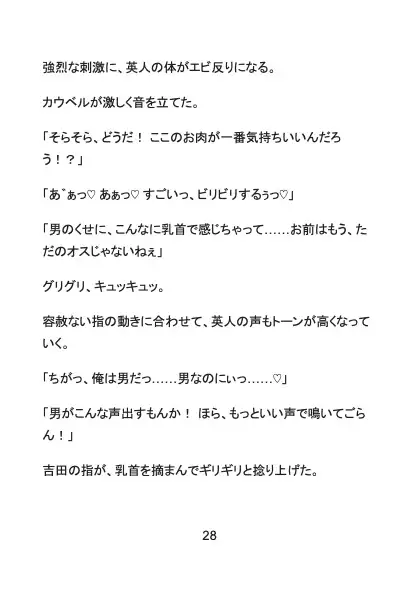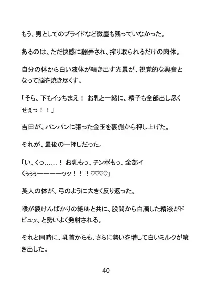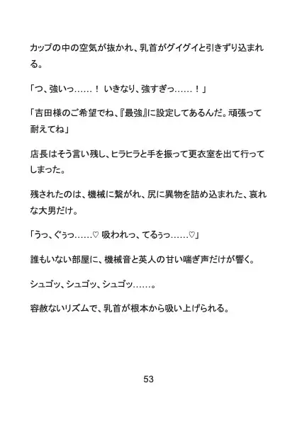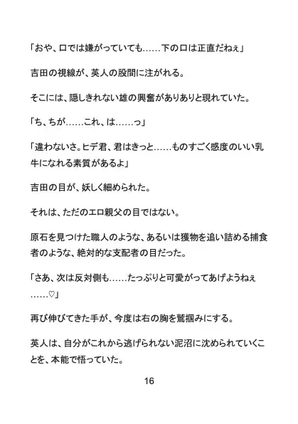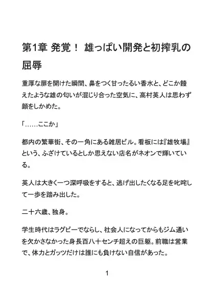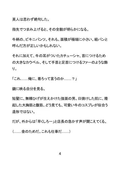 店長に見初められた英人は、屈強な肉体に似合わぬ「牛柄の極小ビキニ」と「カウベル」を身に着けさせられる。 最初の客として現れたのは、冴えない中年男・吉田。だが、そのねっとりとした手技は、英人の性感帯を的確に開発していく。 未開発だった大胸筋を揉みしだかれ、敏感な乳首を吸い上げられ、生まれて初めての「母乳」を噴き出してしまう英人。