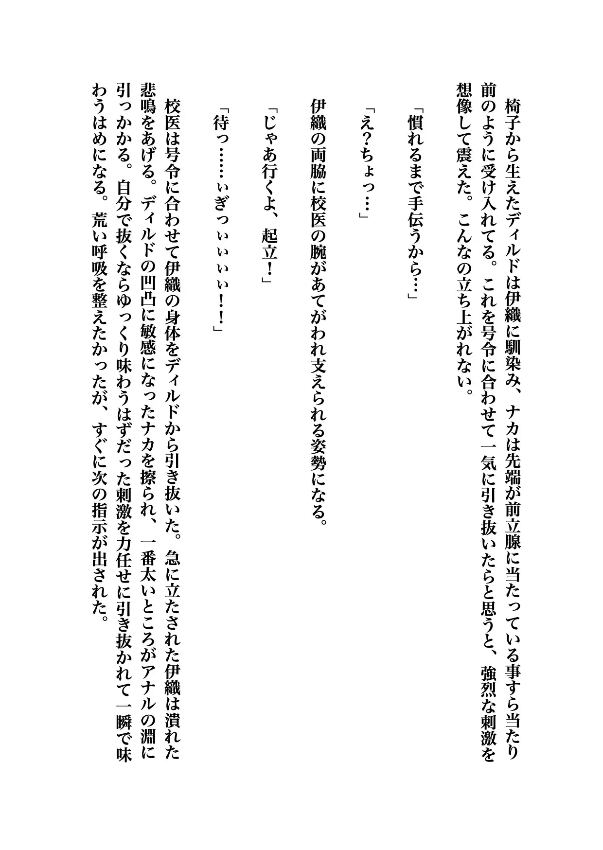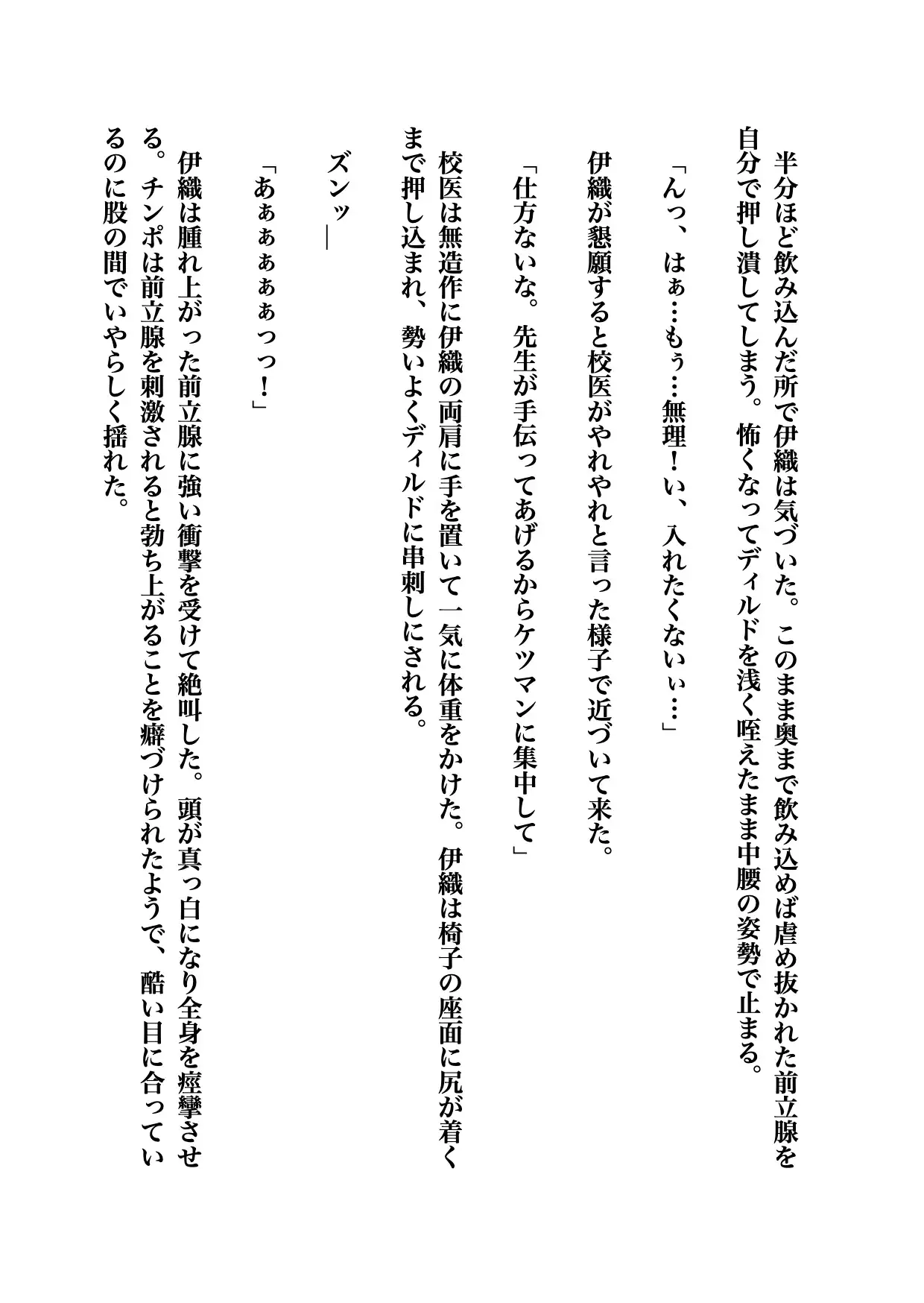 伊織は顔を真っ赤にしながらゆっくり首を横に振った。校医は嫌がる伊織のチンポに手を添えて優しく擦る。勃ち上がったチンポには優しい刺激すら辛かった。先端の鈴口から溢れた先走りを指の腹で塗り広げられた。伊織はたまらずに叫ぶ。