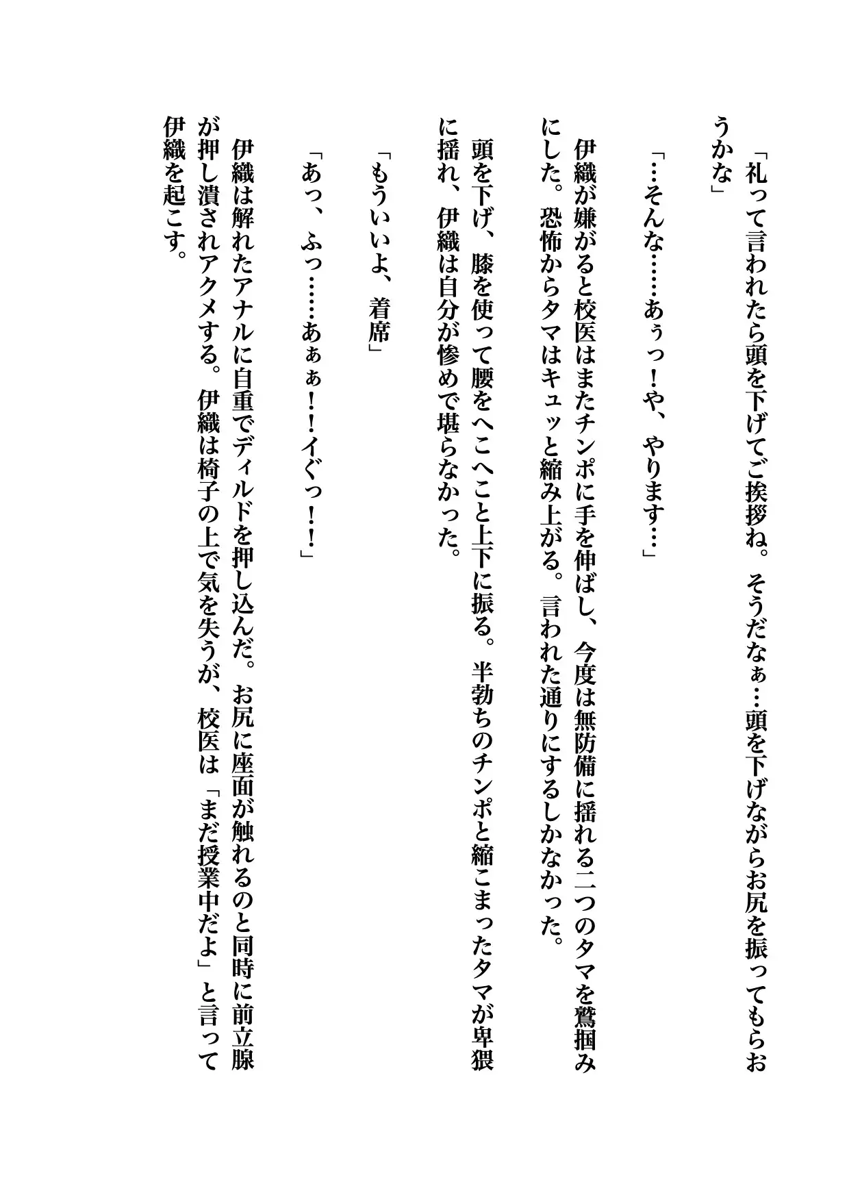 学園で伊織を待ち構えていたのは校医こと先生。伊織は先生の手で投薬治療をされ、いやらしい授業を受けさせられる。