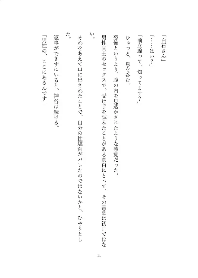 「ここですよ。前立腺…わかります?」失恋直後の真白は、訪れた整体サロンで、施術師・神谷の施術を受けることになる。