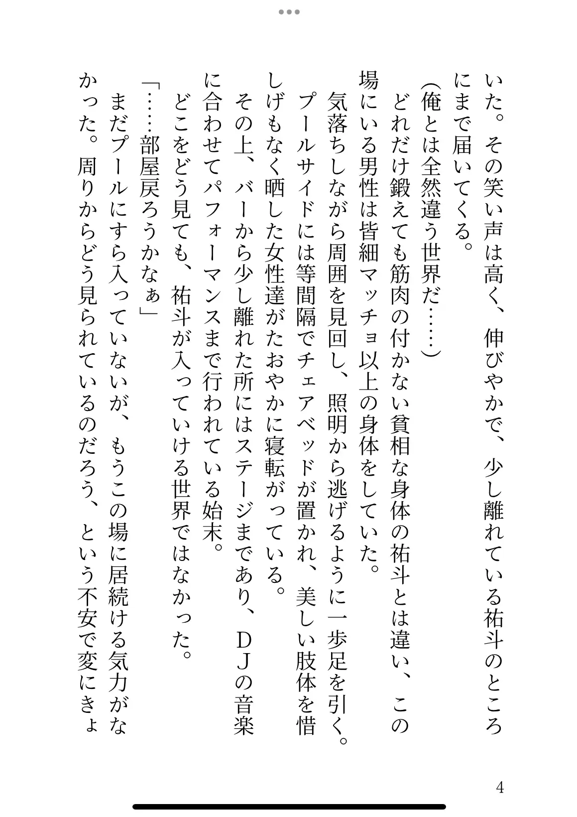 ナイトプールにやってきた祐斗だが、早々に片思い相手の幼馴染と逸れてしまう。ノリのいい客たちから離れながら幼馴染を探すも、なかなか見つからない。