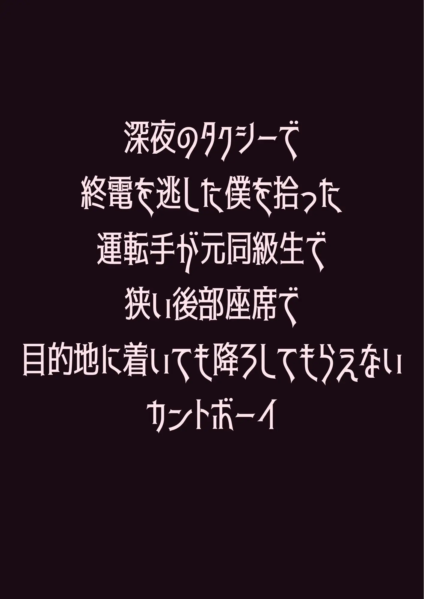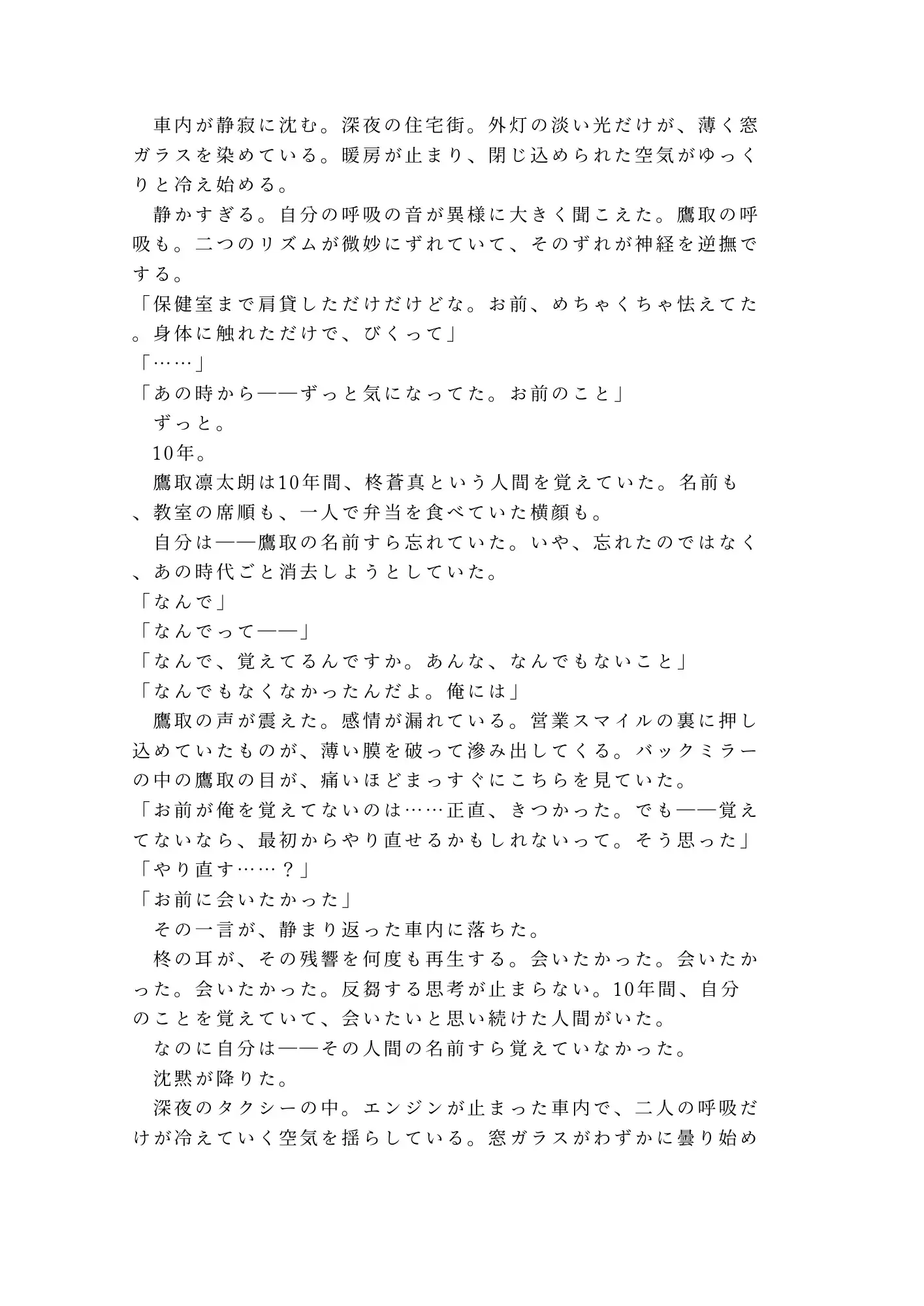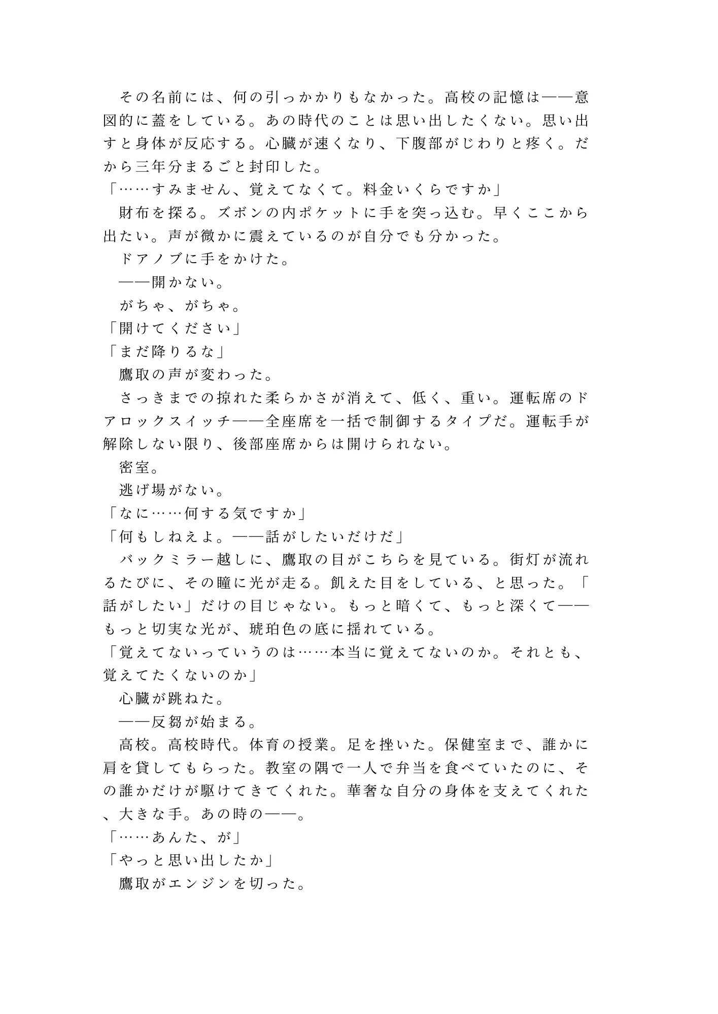 深夜0時、終電を逃した僕を拾ったタクシーの運転手は――10年前、同じ教室にいた男だった。酔い潰れた後部座席で目を覚ました柊蒼真を待っていたのは、高校時代の元同級生・鷹取凛太朗。10年間、たった一度肩を貸しただけの相手をずっと忘れられなかった男。目的地に着いてもドアロックは解除されない。「逃がさない」——その低い声が、封印していたはずの記憶と身体を、否応なく暴いていく。