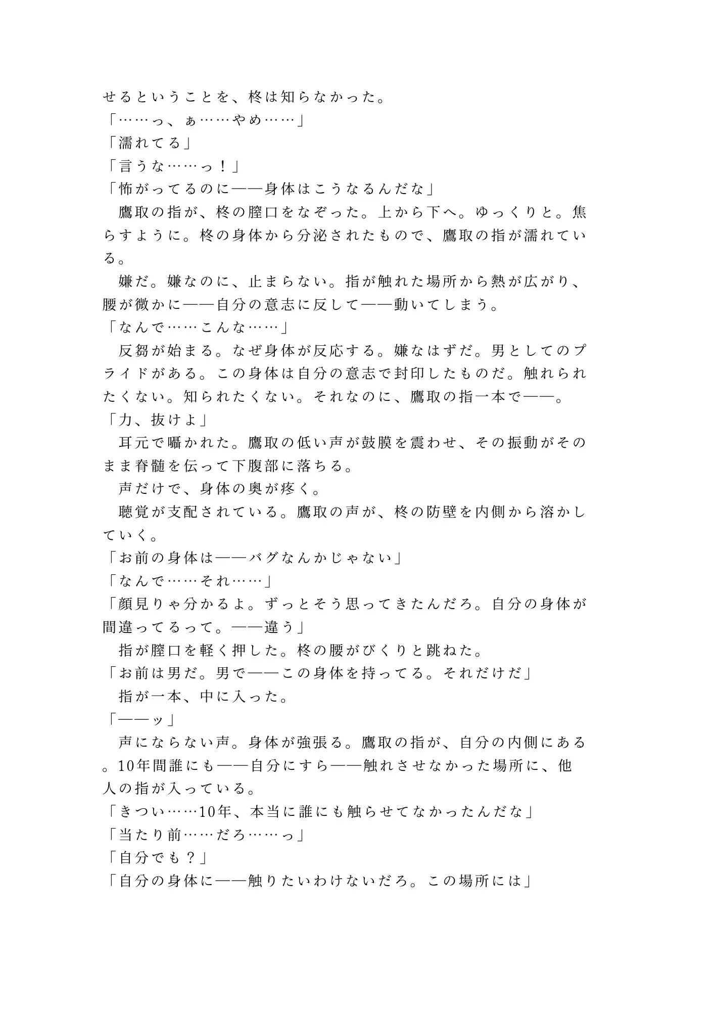 柊蒼真はカントボーイ。男として生きながら、誰にも明かせない身体の秘密を抱えて生きてきた。高校時代ごと記憶に蓋をして、自分の身体に触れることすら避けてきた10年間。一方の鷹取は、あの日肩を貸した瞬間に「気づいていた」。気づいた上で、黙っていた。誰にも言わなかった。その沈黙は優しさだったのか、それとも執着の始まりだったのか。