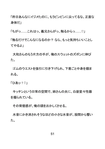 エロ漫画の恥ずかしいセリフを言わされ、敏感な乳首を弄られ、姉の夫に開発されていく身体。 さらに翌日には、姉の勝負下着(Tバック)を無理やり履かされ、男の身体には狭すぎる布地で股間を締め付けられながら、アナルを執拗に責め立てられる。