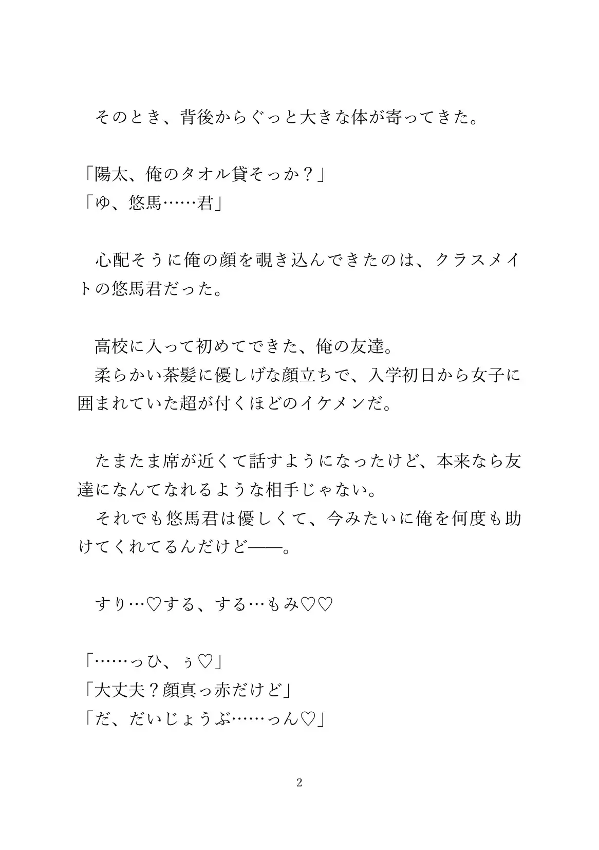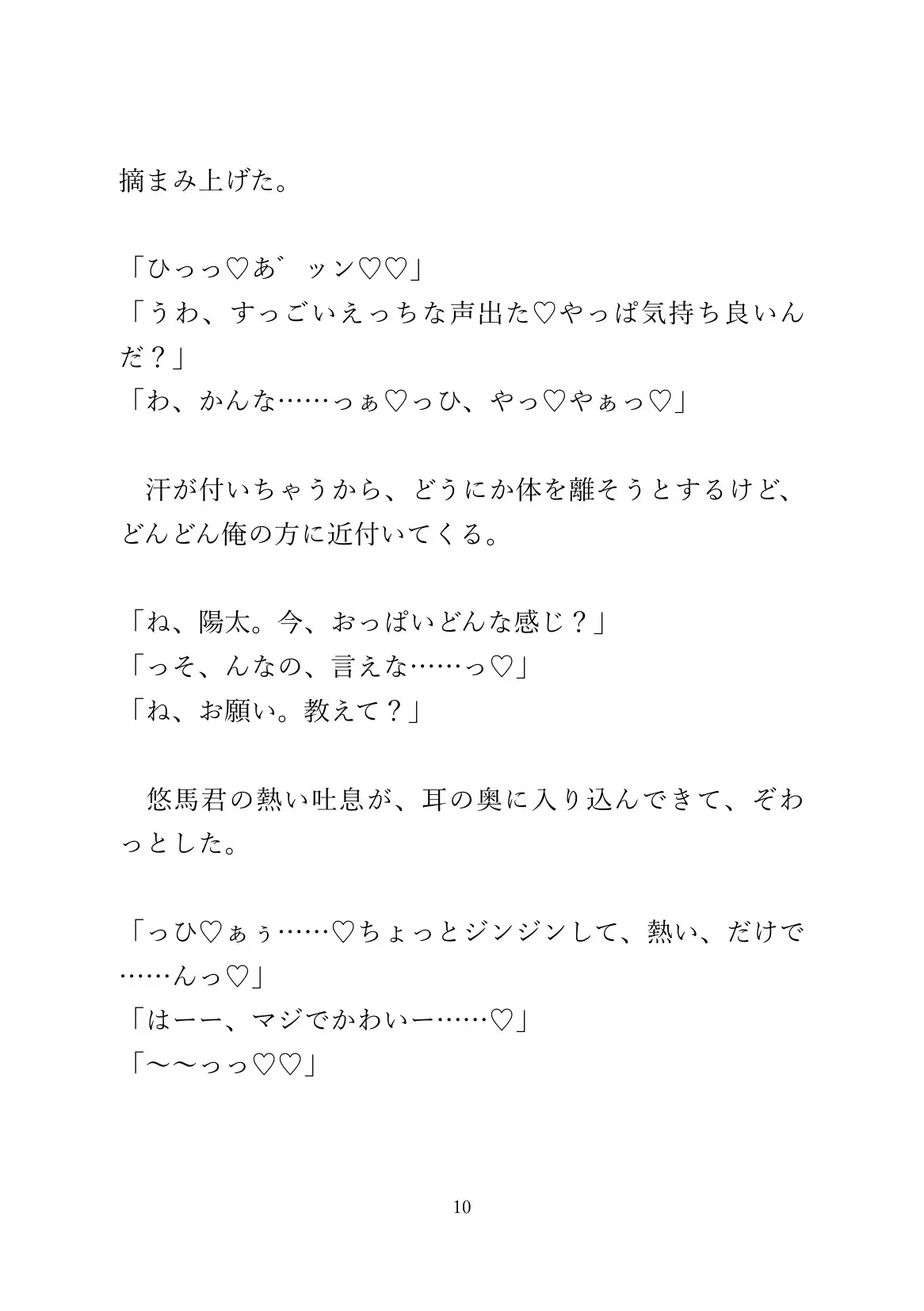 そのうち受けの方もどんどん気持ち良くなって、自分から攻めの精液を乳首に塗り込んでどんどん気持ち良くなってます。文字数はハート、濁点など込みで約12000字程度(42P)