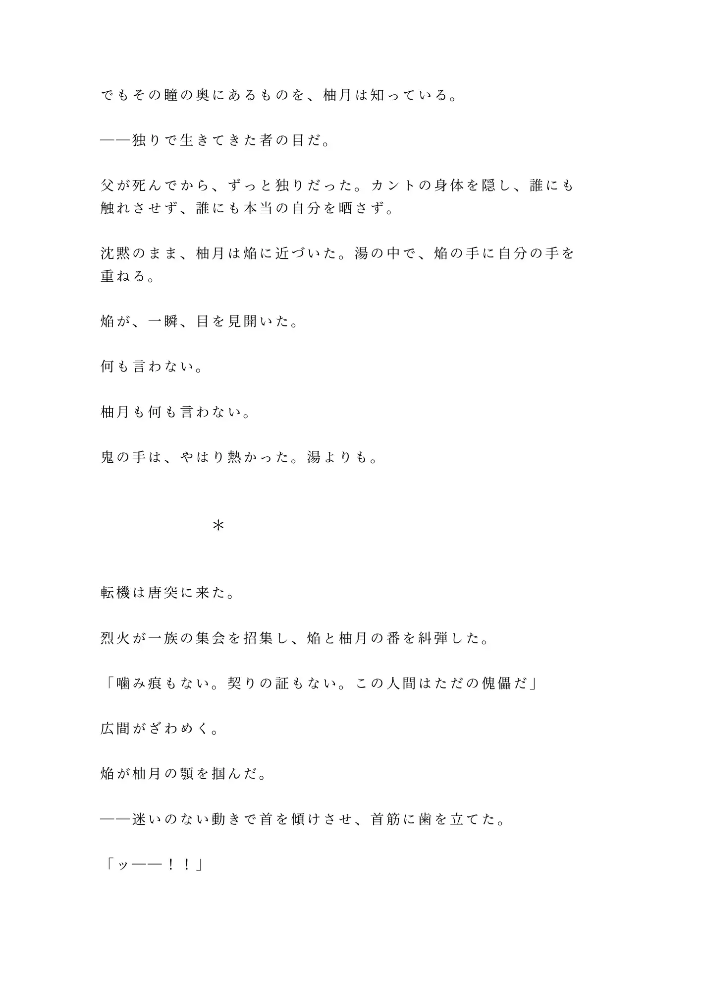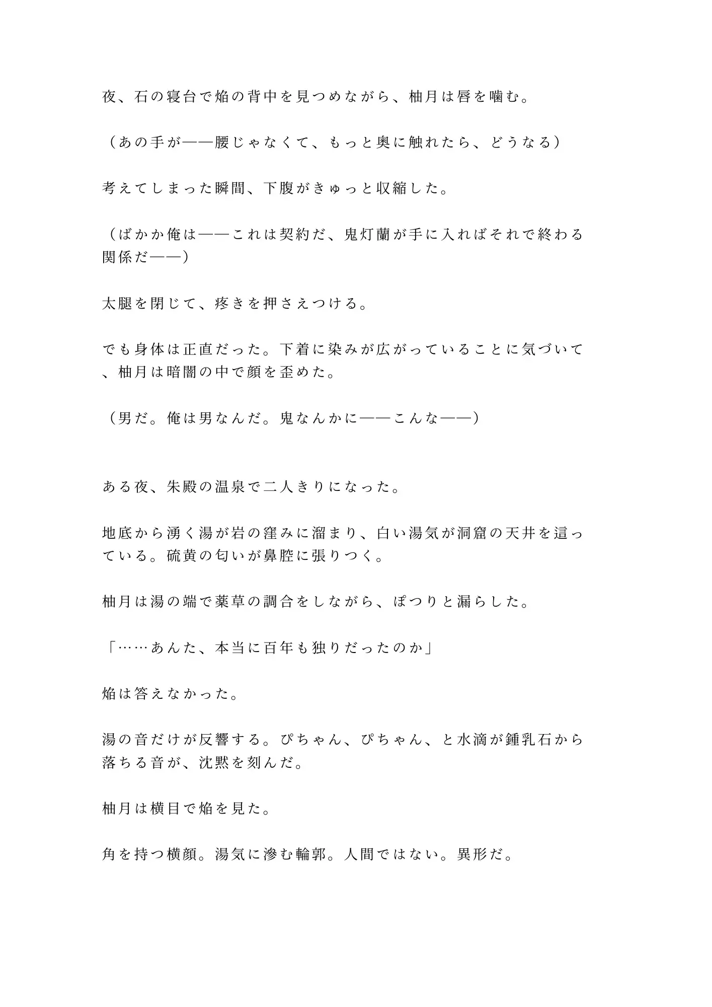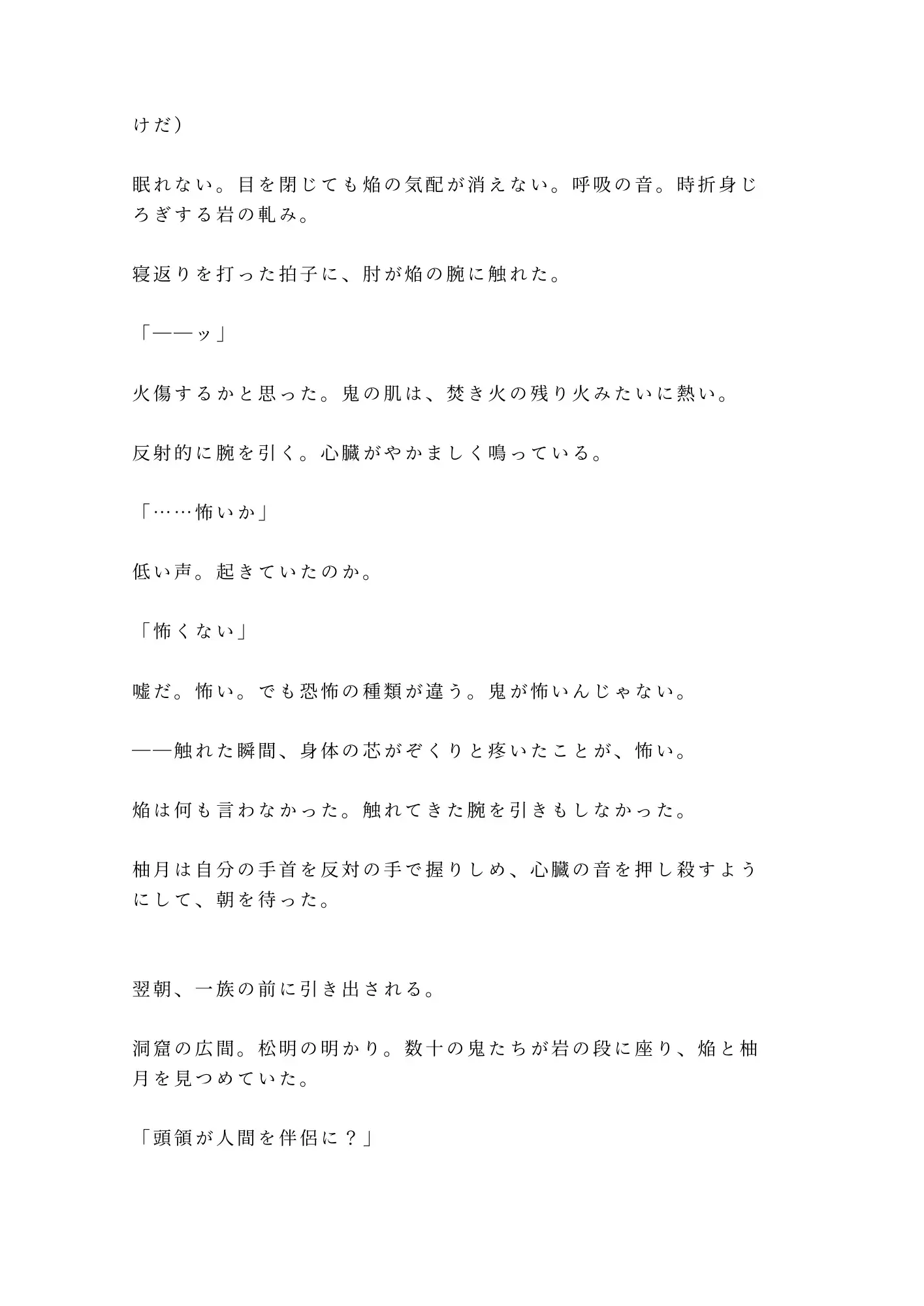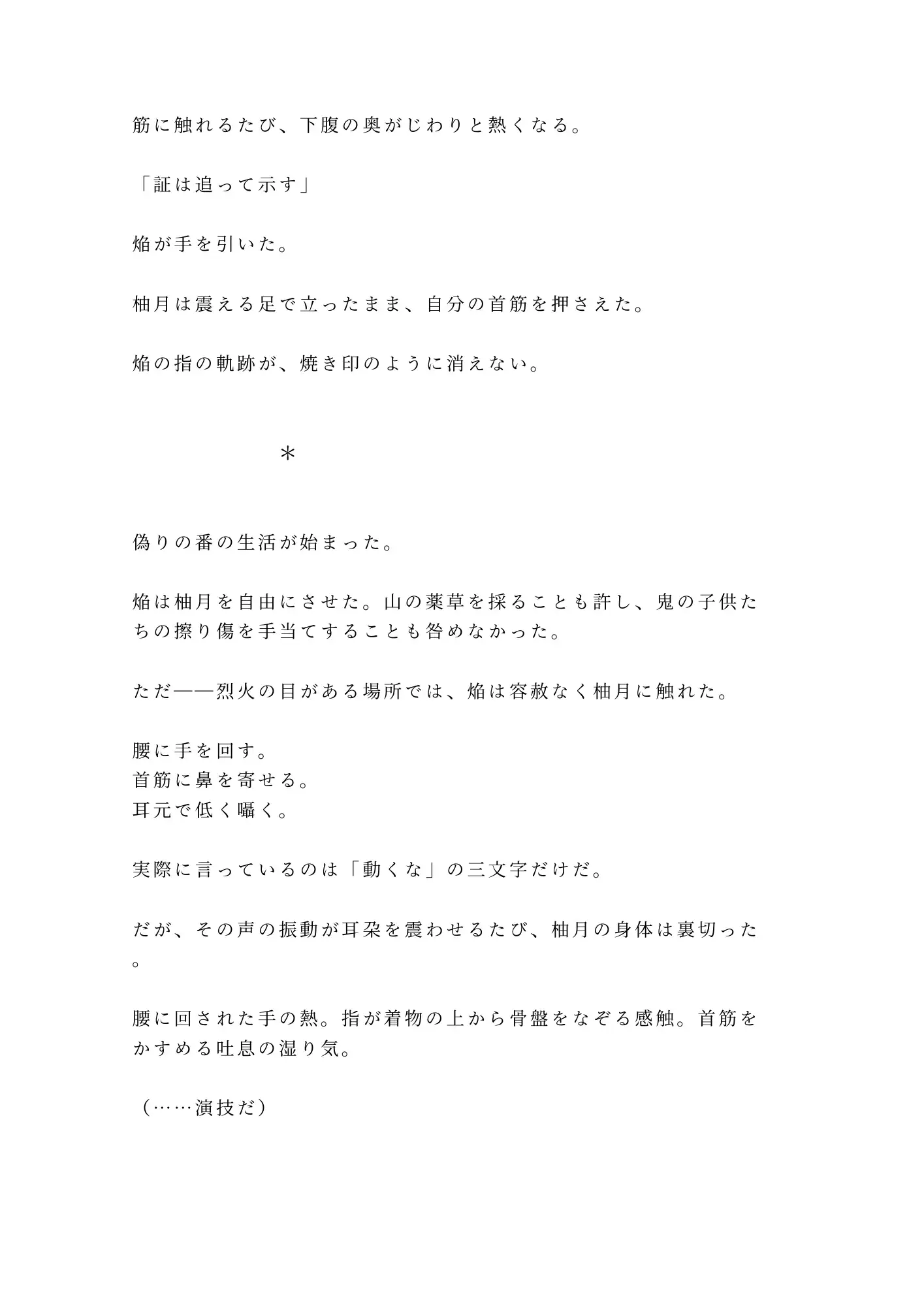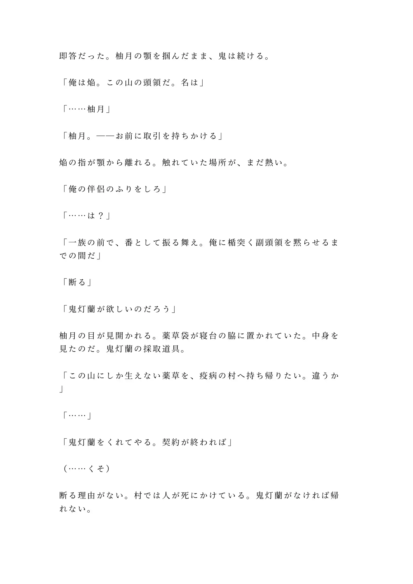焔に秘密を暴かれた柚月は、薬草と引き換えに「偽りの恋人」を演じることを強いられる。鬼たちの宴で焔の「番」として振る舞ううちに、柚月は焔の孤独と、鬼の一族が抱える秘密に触れていく。