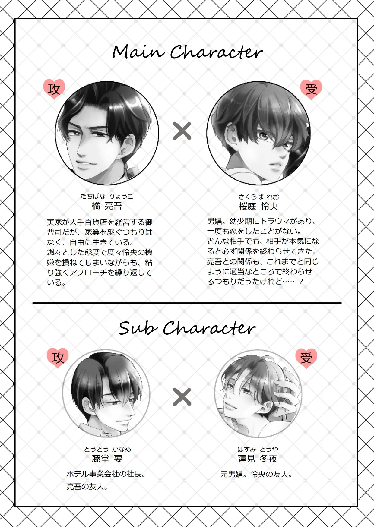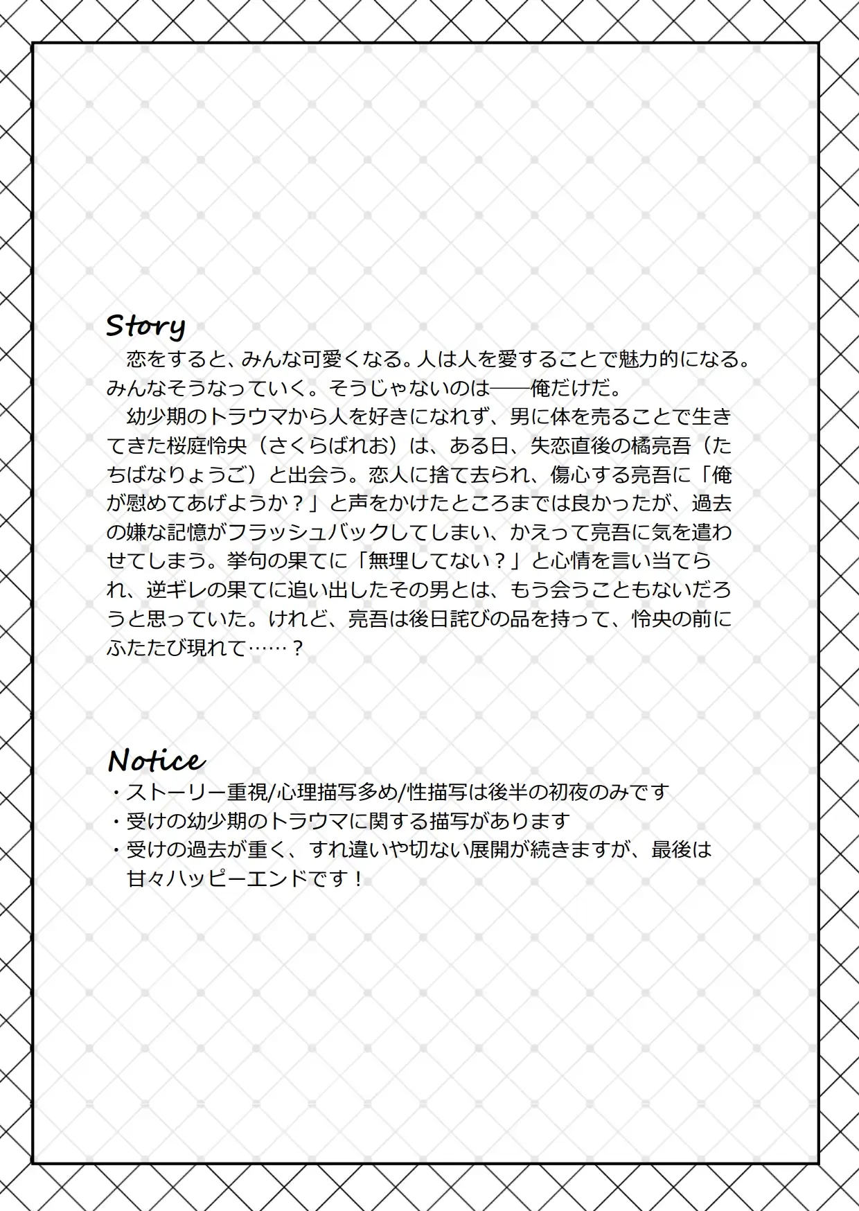 幼少期のトラウマから人を好きになれず、男に体を売ることで生きてきた桜庭怜央(さくらばれお)は、ある日、失恋直後の橘亮吾(たちばなりょうご)と出会う。恋人に捨て去られ、傷心する亮吾に「俺が慰めてあげようか?」と声をかけたところまでは良かったが、過去の嫌な記憶がフラッシュバックしてしまい、かえって亮吾に気を遣わせてしまう。挙句の果てに「無理してない?」と心情を言い当てられ、逆ギレの果てに追い出したその男とは、もう会うこともないだろうと思っていた。けれど、亮吾は後日詫びの品を持って、怜央の前にふたたび現れて……?