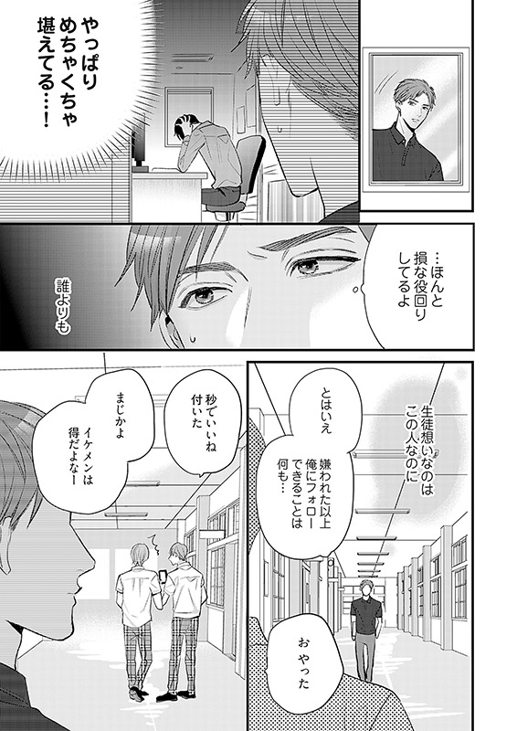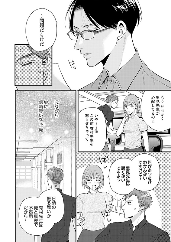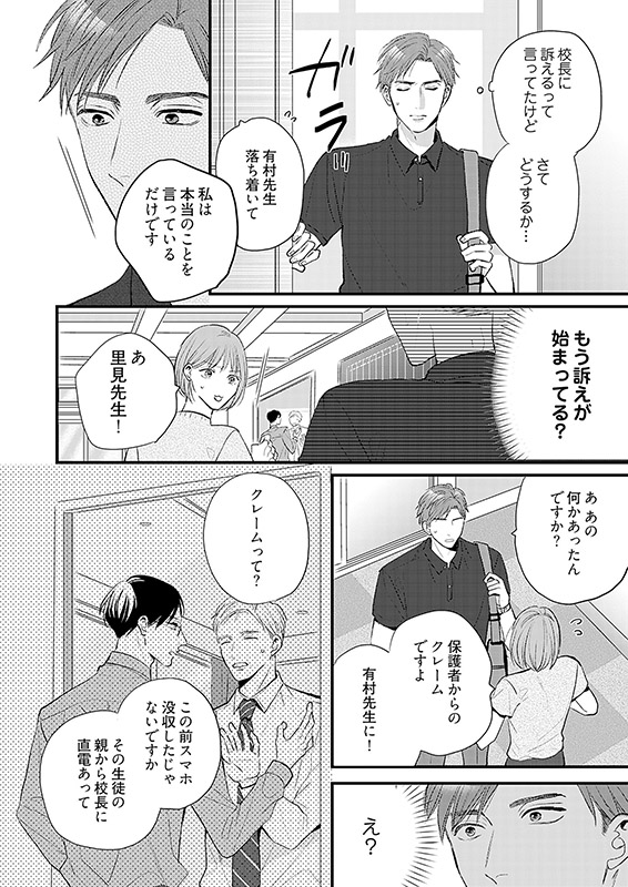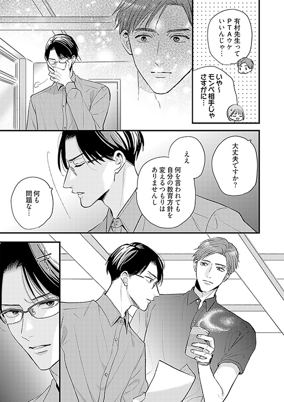 同僚教師や生徒から好かれ、抜群のコミュ力を自負する教師の里見には、苦手な男がいる。カタブツで周囲から遠巻きにされてる、隣クラス担任の有村だ。ルールに厳しく、プライベートな会話や誘いを一切受け付けない有村は、まさに鬼門の相手。そんなある日、「有村先生の背中には龍がいる」という不穏な噂を耳にした里見は有村と視聴覚室で二人きりになって…?