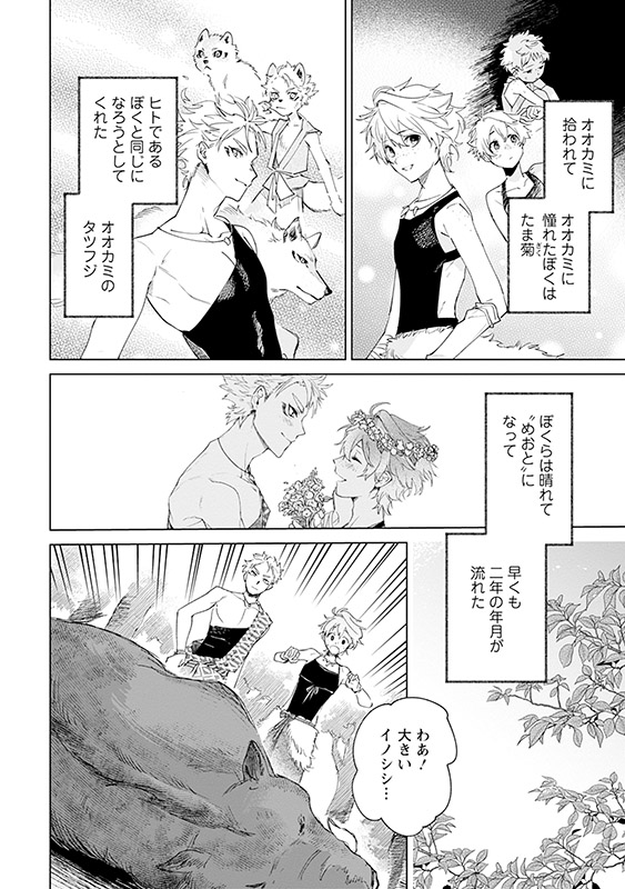 狼の群れで育った青年・たまと、狼のタツは、群れの仲間たちに祝福され、「めおと」として一緒に暮らしている。