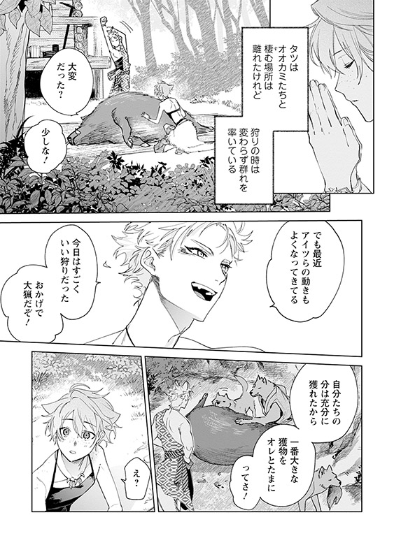 狼の縄張りとヒト里のあいだに家を建てた2人は、どちらの種族とも交流しながら、仲睦まじく暮らしていた。ある日たまは、買い物に訪れたヒト里で、ある噂を耳にする。近くの山で火事があり、そこには「ヒトならざる者」が棲んでいたという。