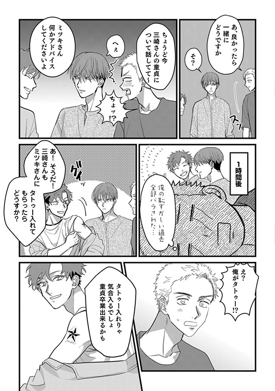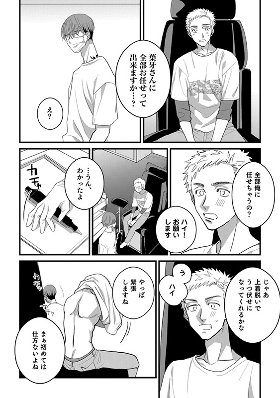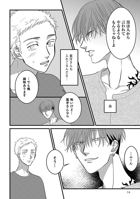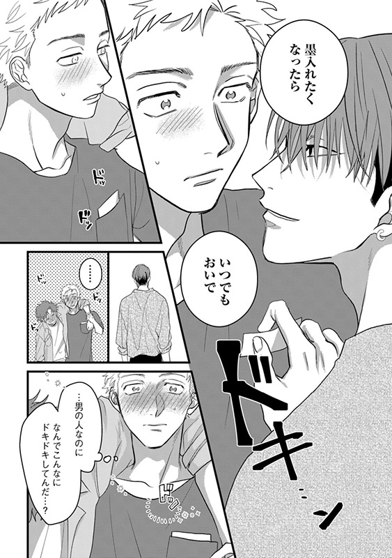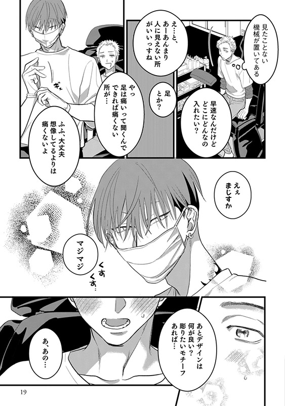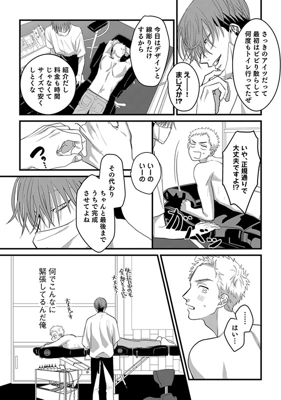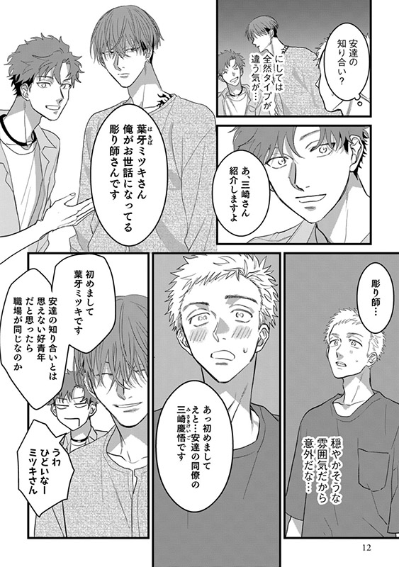 彼の纏う妖艶な雰囲気につい見惚れてしまった慶悟は、ミツキに憧れを抱き、緊張しながらも彼の経営するスタジオでタトゥーの施術してもらうことに。