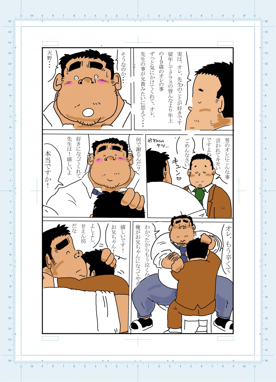 不良生徒に絡まれ、悔し泣きしているところを、弟のように可愛がっていた天野に見られ、天野に慰められると、マッチョ先生は堪えきれず、天野にキスをしてしまうのであった。