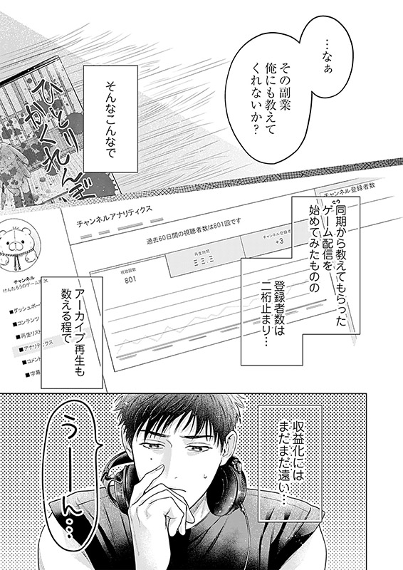 金属加工工場に住み込みで働いている須々木謙太郎(すずきけんたろう)は、上司からのパワハラに限界を感じていた。そこで、同僚から教えてもらった副業(ゲーム配信)を始めたのだが、世の中はそんなに甘くはなく、登録者は二桁止まり、再生数も数えるほど…収益化さえもできていなかった。