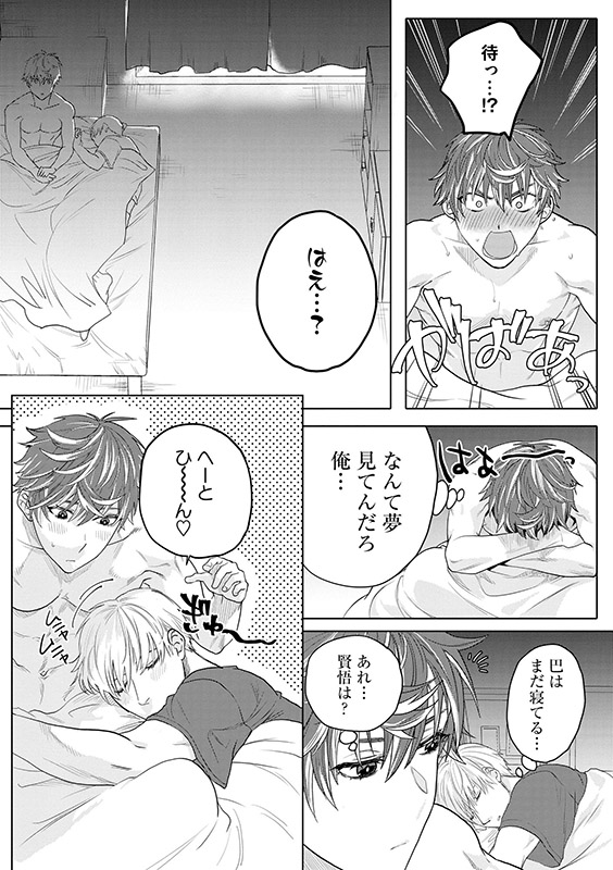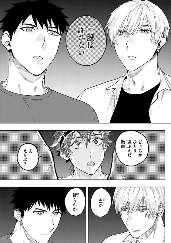 焦らすように触れてくるふたりの指先に反応してしまった徹虎を見たことでふたりのタガが外れてしまい――。