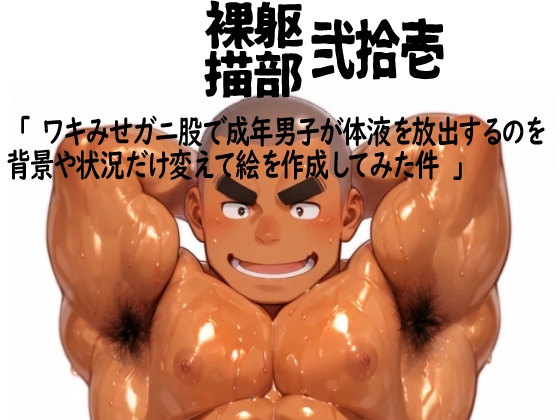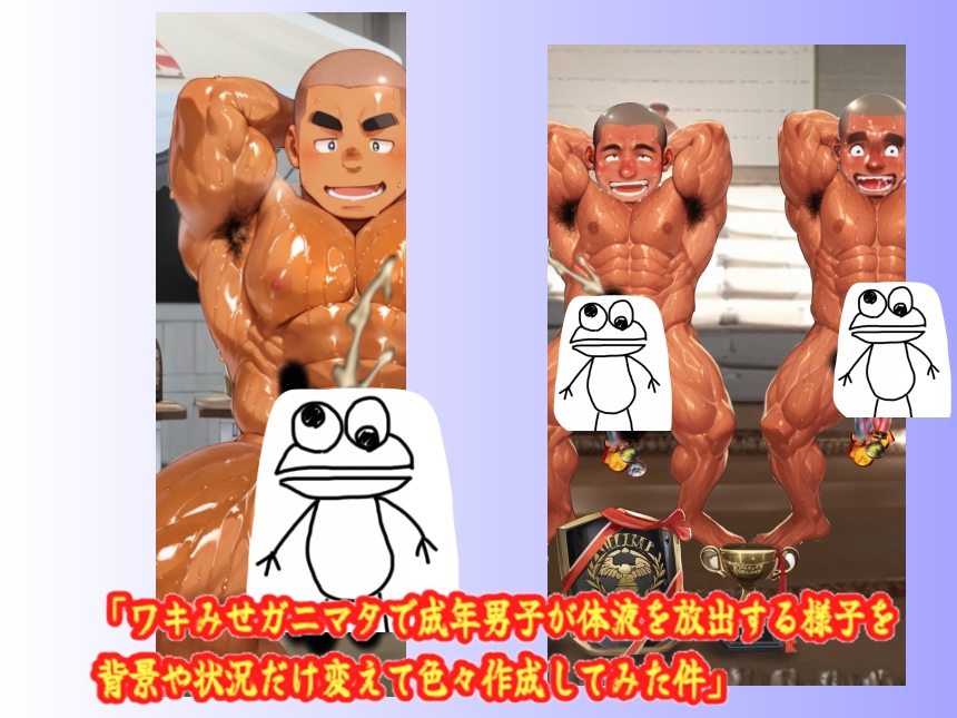 ガチムチ筋肉質男子がワキみせガニマタで射精する様子が大好物でして、AIの利点であるちょっとずつ違う絵を沢山生成出来るという点を利用しまして、ワキみせ以下略の基本的なポーズだけ共通で、後の背景画像とかシチュエーションとかを変えたイラストを作ってみました。