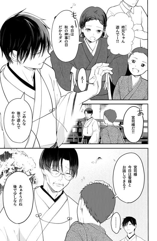 柊は宮司より贖罪という名の体罰を受け、雪はその美しさから信仰の対象であるイキガミ様として生きていた