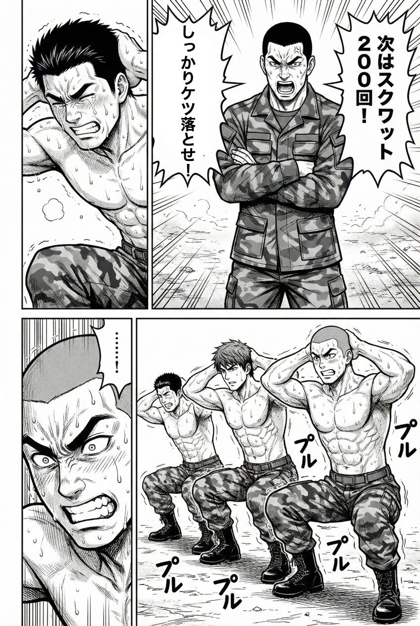 「お前たちを一人前に鍛え上げてやる」 その言葉とともに上着を脱ぎ捨てた男たちの、汗と筋肉が躍動する特別訓練が始まる。腕立て、スクワット、そして終わりのないランニング。極限状態の中で響くのは、荒い息遣いと久米の怒号のみ。「連帯責任だ、全員はじめからやり直し」――理不尽な命令に耐え、震える足で立ち上がる男たちの雄姿と、鬼教官・久米が森田に見せるサディスティックな執着。 痛みと○○の果てに待つのは成長か、それとも……?