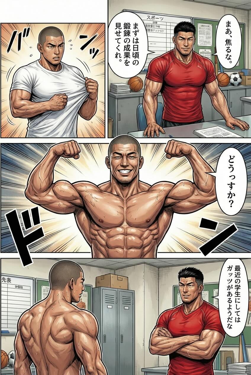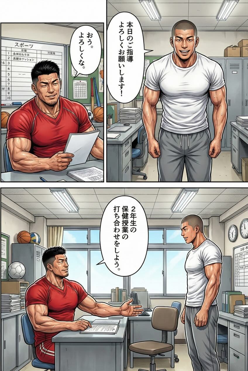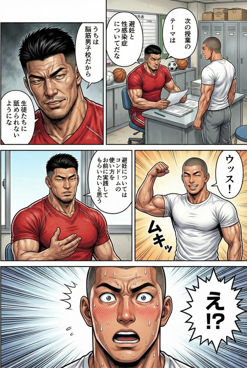 体育教師は、男子校の生徒になめられないためとして、担当する保健体育の授業テーマである「避妊」について、教官室でまさかの「実演リハーサル」を命じる。絶対的なOB命令に、後輩は鍛え上げた肉体を晒して応えようとするが……。