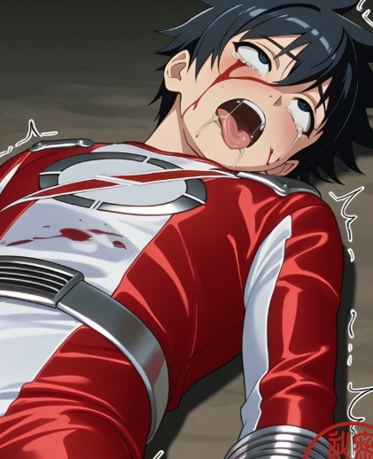 徹底的なバトルシーンから敗北までの無様な姿を収録し、全ページマスクオン・オフ混在。