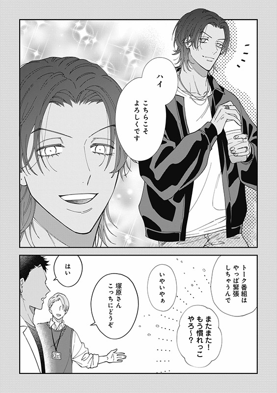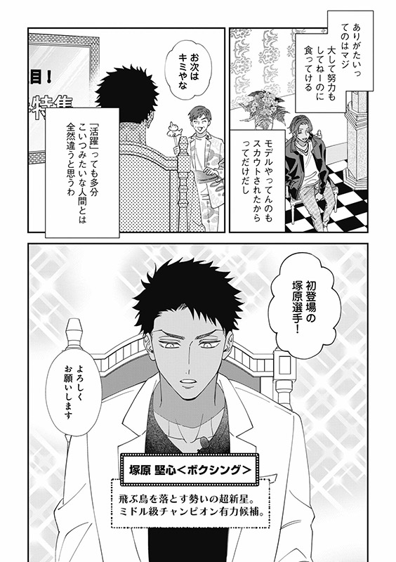 いま、飛ぶ鳥を落とす勢いで活躍中のプロボクサー・塚原堅心(つかはら けんしん)だ。初めて呼ばれた大人気バラエティー番組で堅心と共演することになった怜皇。