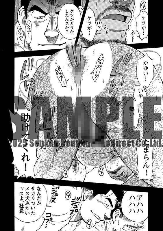 熊澤は突然、理解した。「排水口に詰まっていた毛は、こうやってオマエが剃ったウケ野郎たちの…」そして、最初から西岡に狙われていて、まんまとハメられていたのではという懸念…やがてそれは現実となる。「ケツが…ケツが…たまらん!」「サカリついたメス犬みたいッスよ、社長」発情した二人の雄のサカり合いは、まだ始まったばかりであった…。