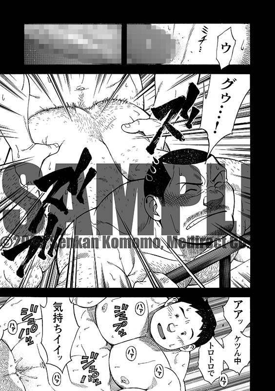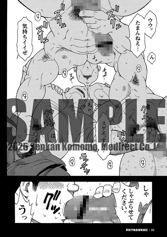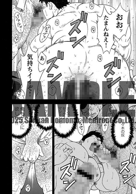 そして、高田の部屋を訪れる熊澤と佐々木。「ガハハ、二人の交尾、濃厚だったぞ」と笑う高田は、さっきの続きをここでやってくれよと迫る。彼もまた男好きの野郎であった。すると佐々木は「見てるだけでイイんすか?」と、三人でのセックスを提案してきて…。