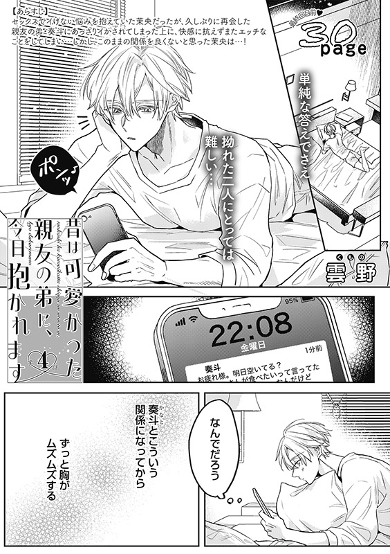 DKサシとナギは今日も恋人ならではの悩みを共有中。今回はそんなふたりの1年生の時のお話!●雲野[昔は可愛かった親友の弟に、今日抱かれます 第4話]