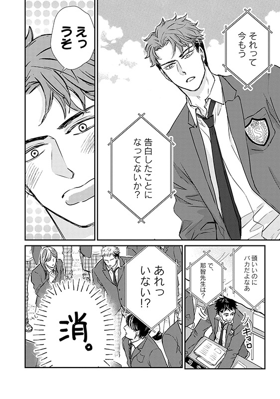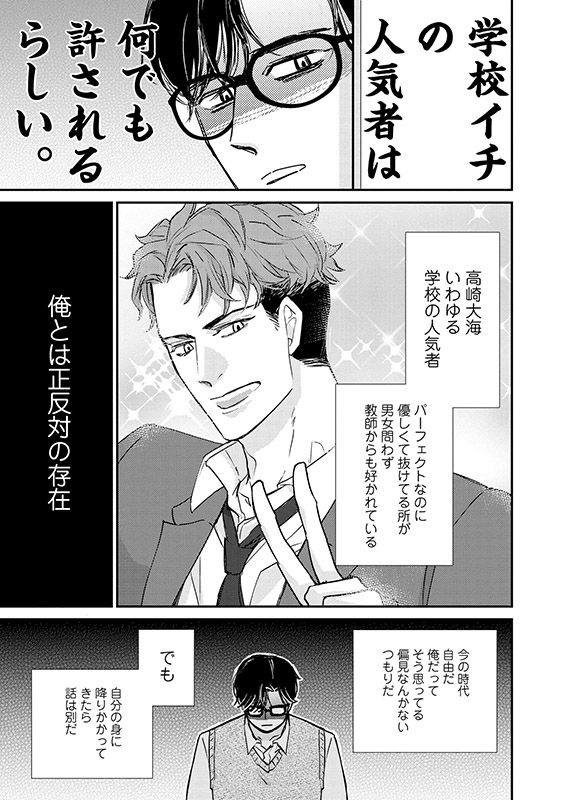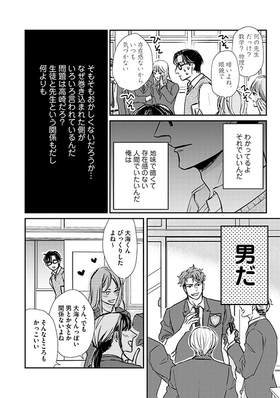 かわかわれてるとうんざりしていた那智だが、高崎はまっすぐ想いをぶつけてきて…?ポジティブ陽キャな校内イチの人気者×平凡を愛する存在感薄めの物理学教師、二人の恋の行方を学校全体が見守る逃げ場のないスクールラブ!