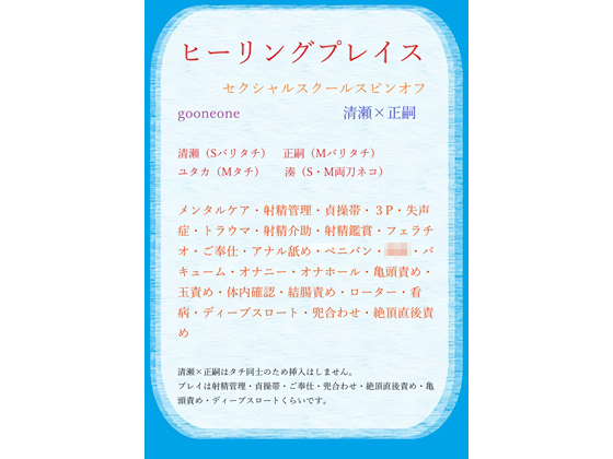 プレイは射精管理・貞操帯・ご奉仕・兜合わせ・絶頂直後責め・亀頭責め・ディープスロートくらいです。3Pは正嗣、ユタカ、湊です。