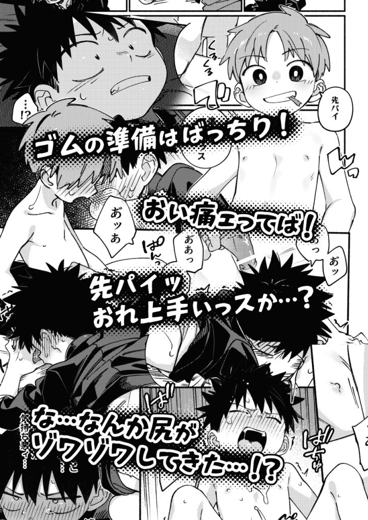 えっちが上手くなりたい後ハイと、なぜか練習台にさせられてしまう不憫な先パイがセックスの練習をする話です。