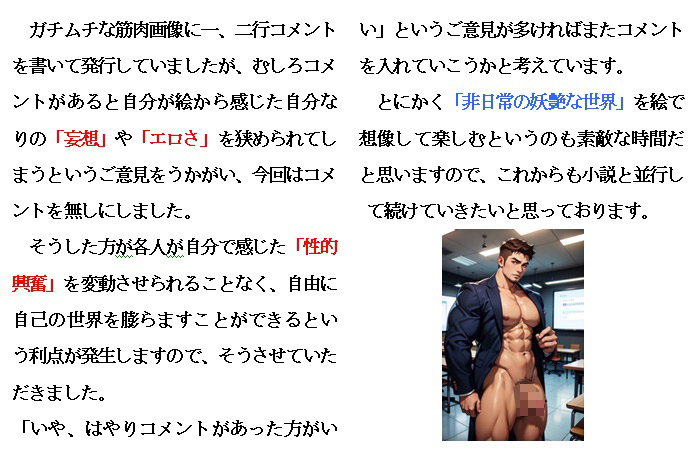 ガチムチな筋肉画像に一、二行コメントを書いて発行していましたが、むしろコメントがあると自分が絵から感じた自分なりの「妄想」や「エロさ」を狭められてしまうというご意見をうかがい、今回はコメントを無しにしました。