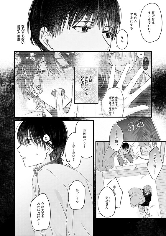 吏功に対して”恩返しをしたい”という純粋な蒼佑の気持ちとは裏腹に、食事をしているだけでも意識してしまう自分に不安を抱いてしまう。