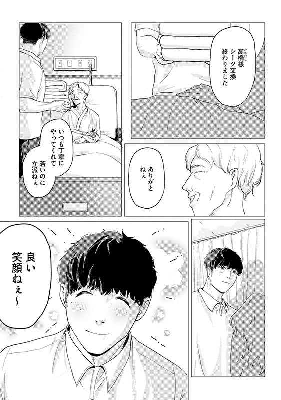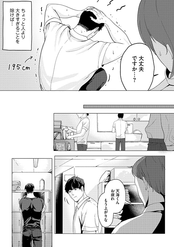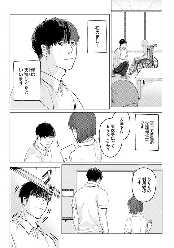 大柄なのに極度の人見知りな介護福祉士・天海しずるは、深夜の海で入水を試みる青年を見かけ救出する。