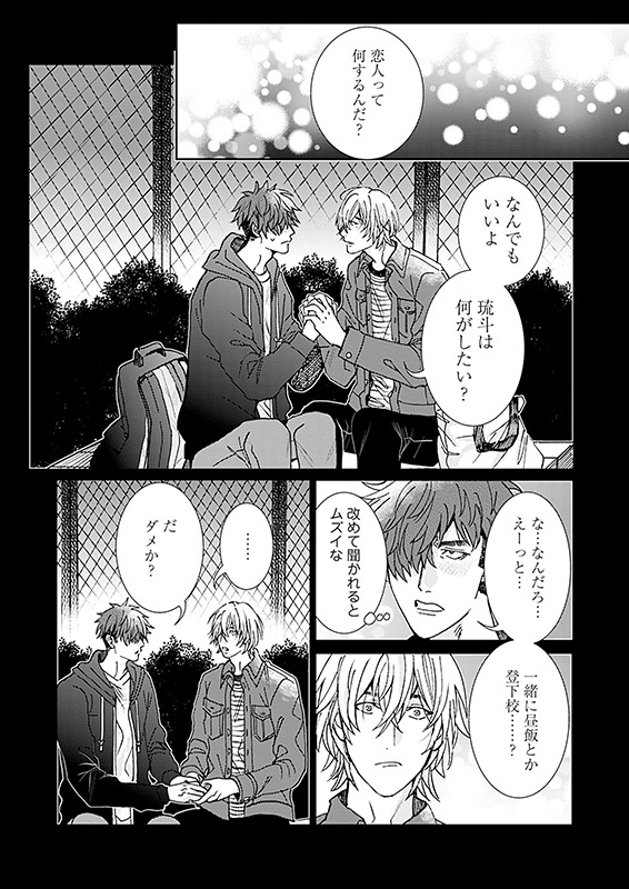 高校時代、とんでもないワルだった琉斗は、心を入れ替え猛勉強の末に大学へ入ったが、一匹狼だった彼は友達の作り方さえ知らなかったのだった…。ところが、そんな彼の前に有坂瞬(ありさかしゅん)という爽やかイケメンが現れる! 同級生との会話という未知との遭遇に、ドギマギしっぱなしの琉斗は──…?