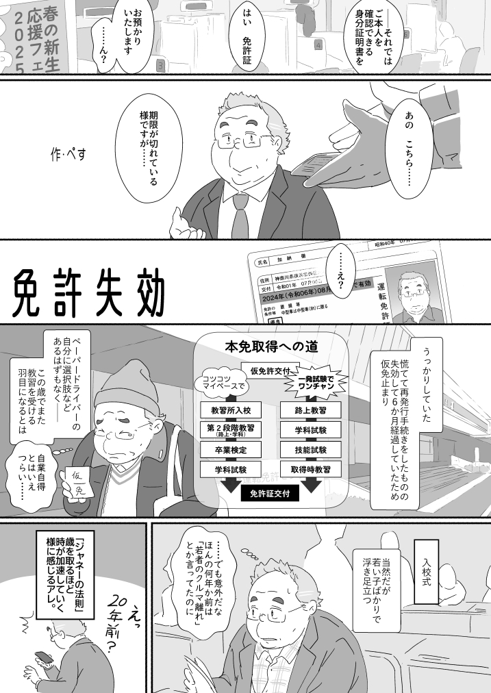 うっかり免許失効したおじさんが教習所へ通うおはなしです。