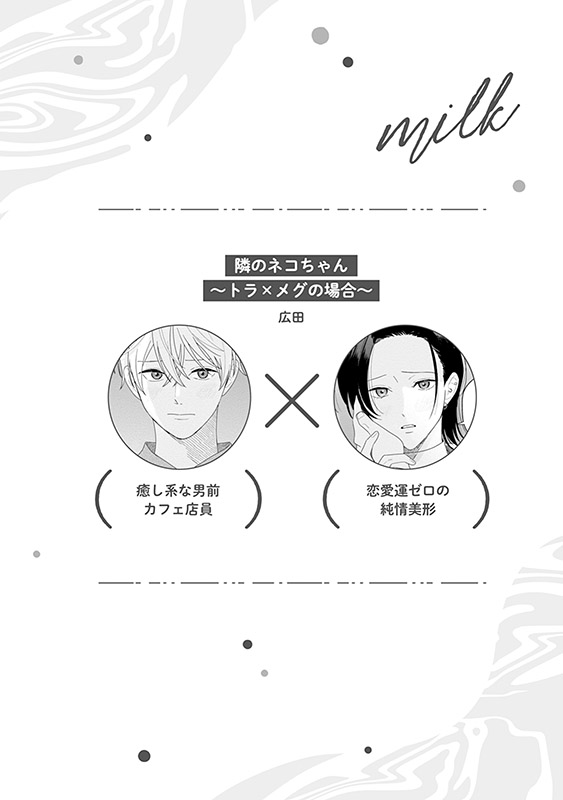 テニスサークルの合宿で、サツキは酔って無防備になった恋人・アヤトを部屋で介抱する。酔った原因が嫉妬によるものだと知ったサツキは、我慢できずアヤトを押し倒して――?・広田「隣のネコちゃん ~トラ×メグの場合~」
